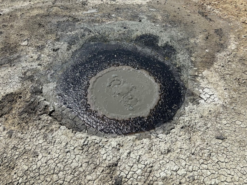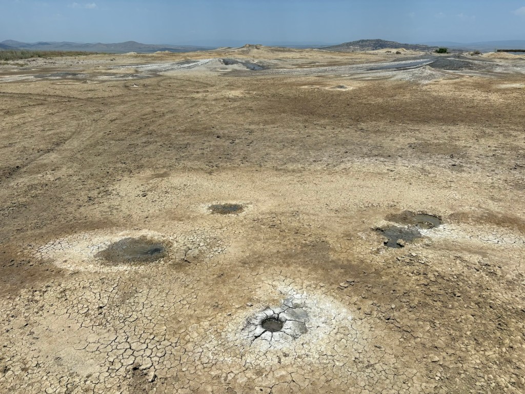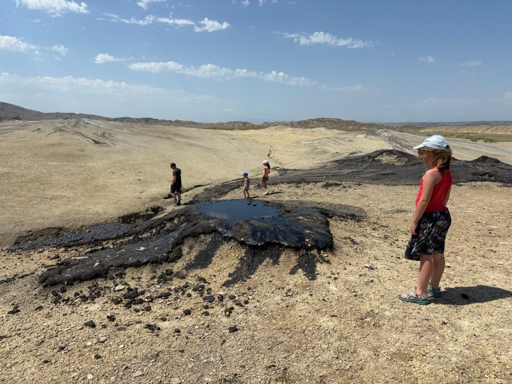 Vervolgens reden we naar Takhti-Tepha, kleine pruttelende moddervulkaantjes die iets impressionanter waren op de drone foto’s in ons boek dan de realiteit. Misschien kwijnen ze zelf wat weg nu bij deze puffende temperaturen? Lia was onder de indruk en fotografeerde mee, Ava dutte liever verder in de auto.