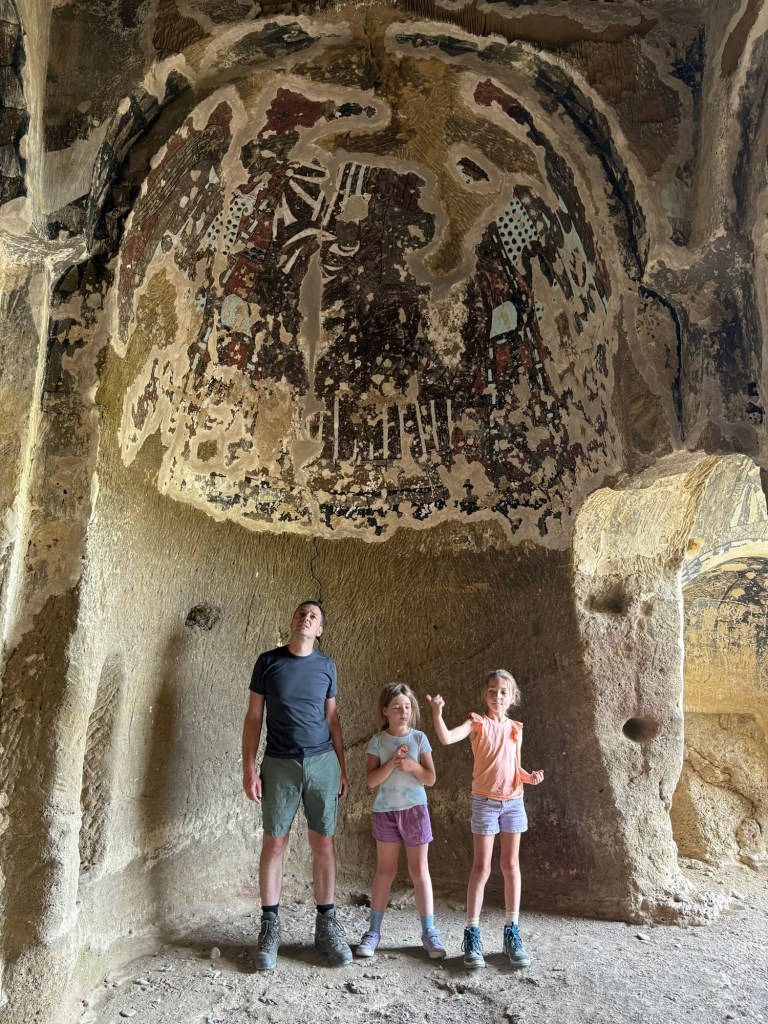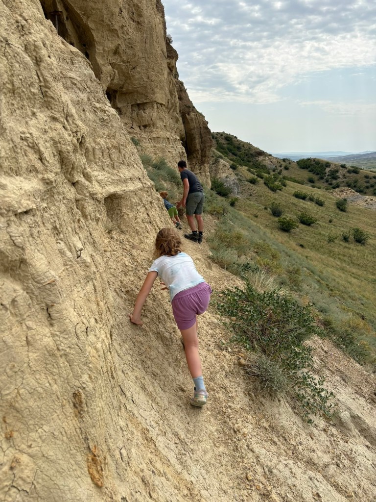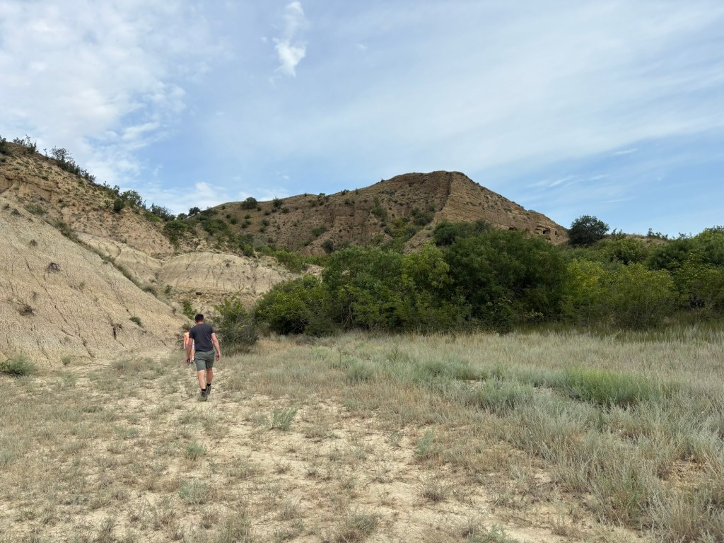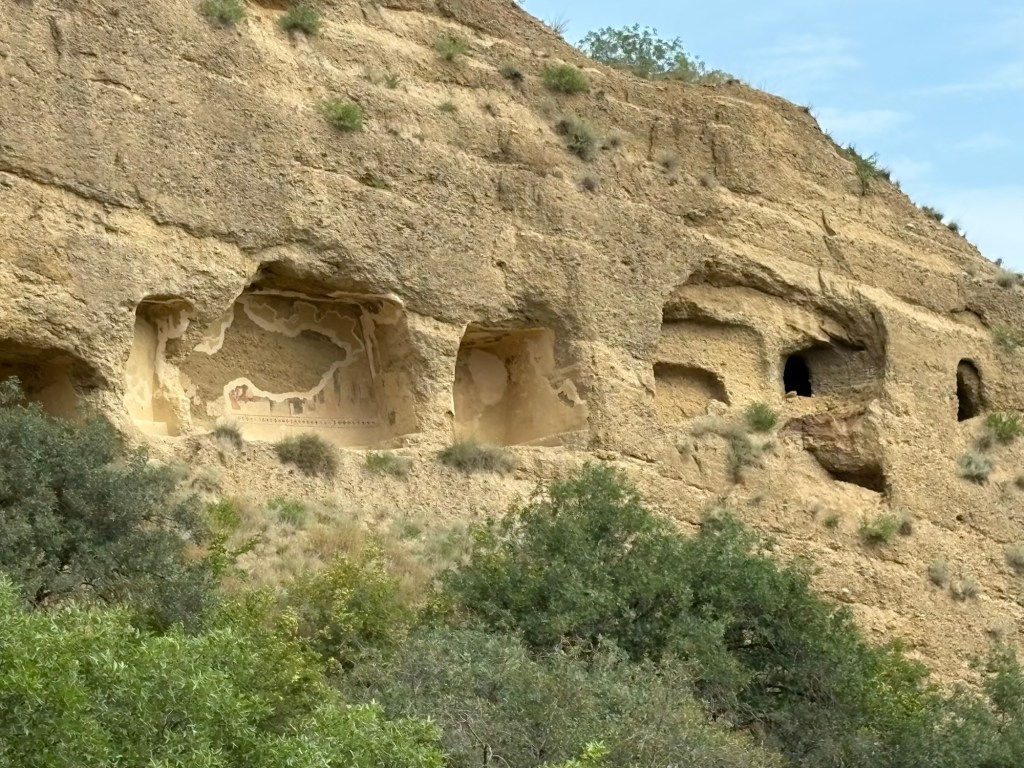 Het tweede rotsklooster Sabereebi was iets duidelijker toegankelijk. Ooit iets meer dan 100 kamers die helemaal met de hand uitgehouwen waren in 6e-8e eeuw. Je zag ook dat ze het iets meer als toeristenspot uitbaten want er stonden zelfs stellingen gemonteerd om verder instorten te voorkomen. Het geheel stond uit 5 grotjes met smal pad. De laatste grotjes hadden de best bewaarde rotschilderingen. Het was best spannend maar samen met de hagedisjes schuifelden we bergafwaarts terwijl ik hier en daar een glibberend kind tegen hield en mezelf afvroeg waarom het eerder een goed idee leek om de sneakers en sandalen aan te houden…. Onderweg naar beneden vonden we nog een slangenhuid en mysterieus slangen(?)ei.
