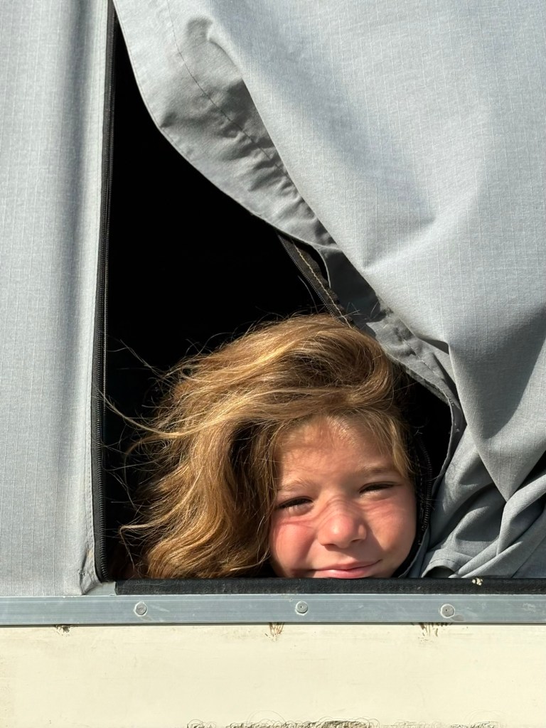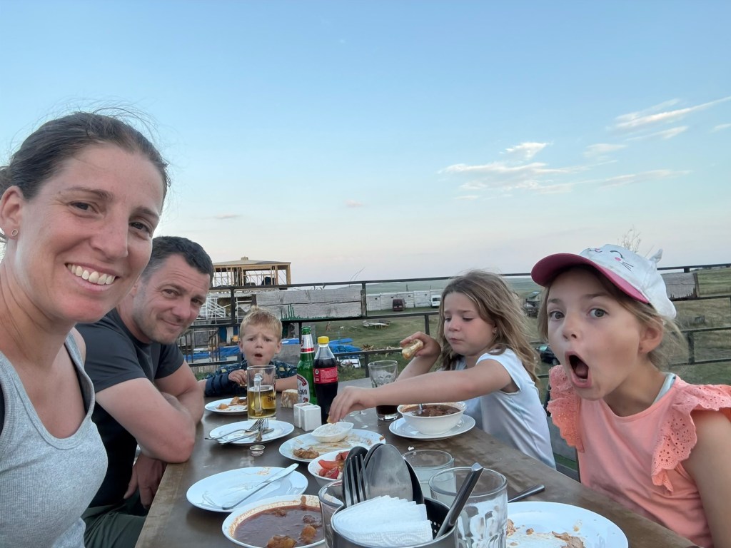Snel schakelen, we sjorden met ons zeil een shelter over de daktent en onze niet zo waterdichte gewone tent. Al snel plensten de eerste regendruppels terwijl de wind in sterkte toenam. Onze giga frigobox die de shelter opspande, werd weggeblazen, de nestelogen van het zeil scheurden verder door dus we bonden echt alles verder vast met wat we vinden konden. Al snel schommelden waterbidons aan een aux-kabel en stonden Christoph en ik zelf als paal het zeil tegen te houden zodat de tent met 3 kids toch ietsofwat droog bleef. Gezien buiten koken met dat weer niet zou lukken, mochten de kids een avondmaal samenstellen met alle koekjes en snoepjes die ze nog vinden konden in onze tas…. Hun geluksdag!
