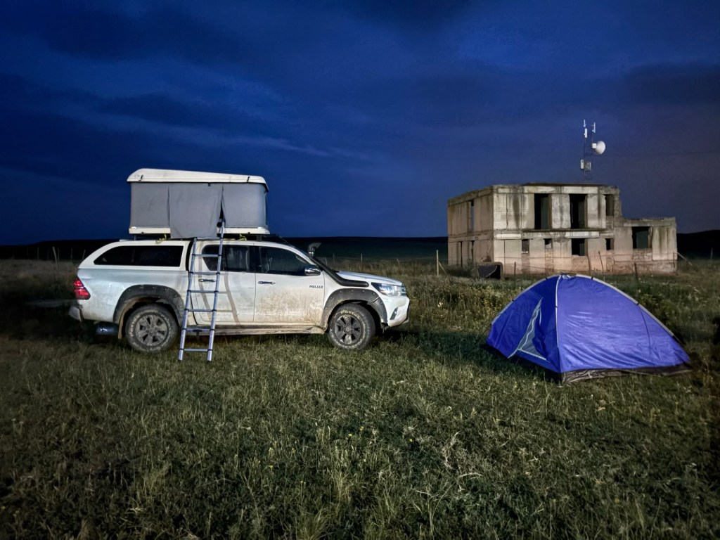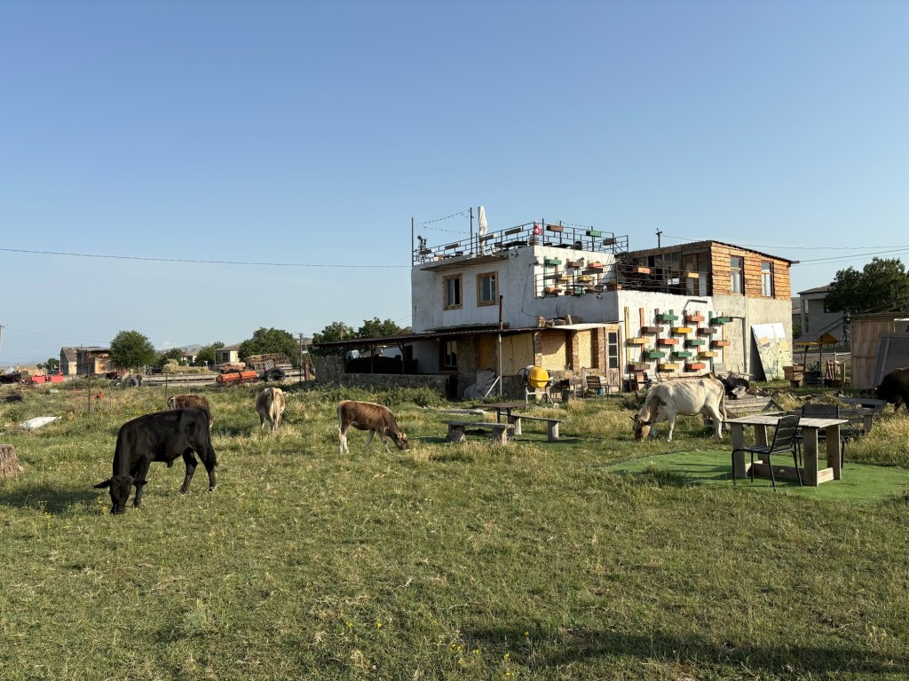 We reden terug nr Udabno voor een overnachtingsplekje. De camping waar we s middags in het restaurantje aten was ondertussen gesloten. We gingen in het restaurant van de rooftopbar vragen hoe het zat met dat bordje “camping” aan hun gevel en mochten gratis in hun tuin kamperen en het sanitair gebruiken. Uit dankbaarheid aten we hun halve menukaart met zicht op het boerderijleven en sampleden we het lokale Georgische bier.