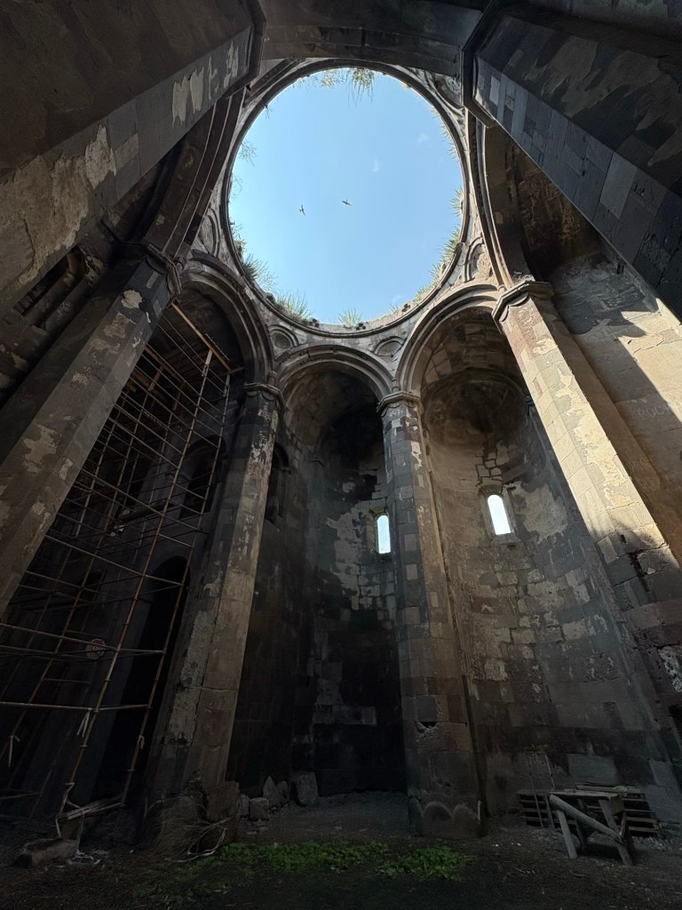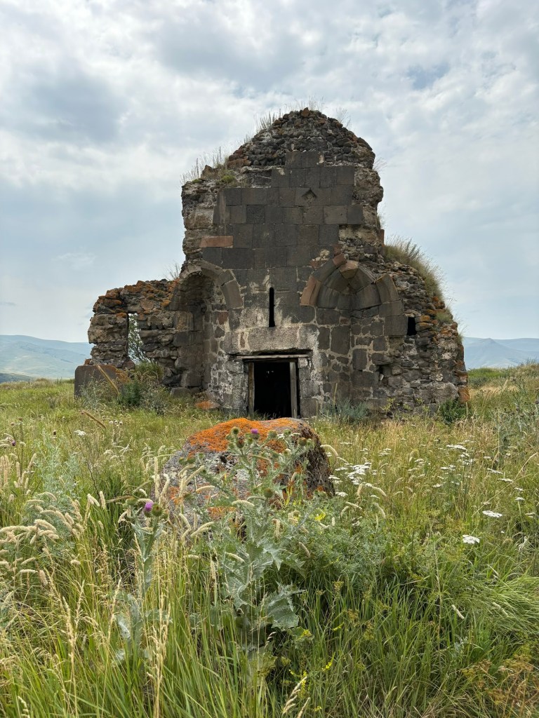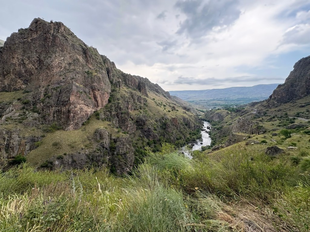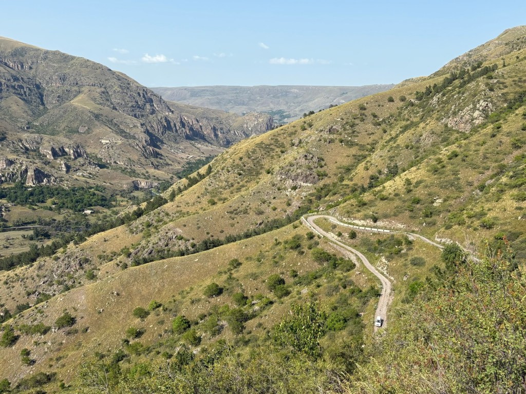 Vervolgens kon de route echt beginnen en reden we voornamelijk langs patattenvelden, door heeeel hoog gras & langs canyon achtige uitkijkpunten een soort van karrespoor achtige route af richting vervallen kerkje 1, vervallen kathedraal 2. Vervolgens door een bos waar we kampvuurhout sprokkelden tot aan een richel die uitkeek op de rotsstad Vardzia.