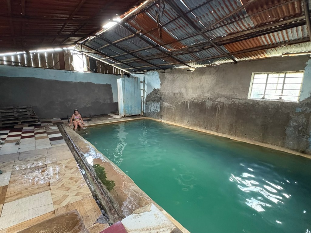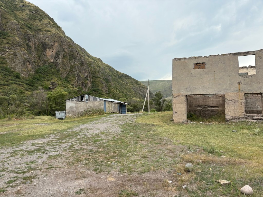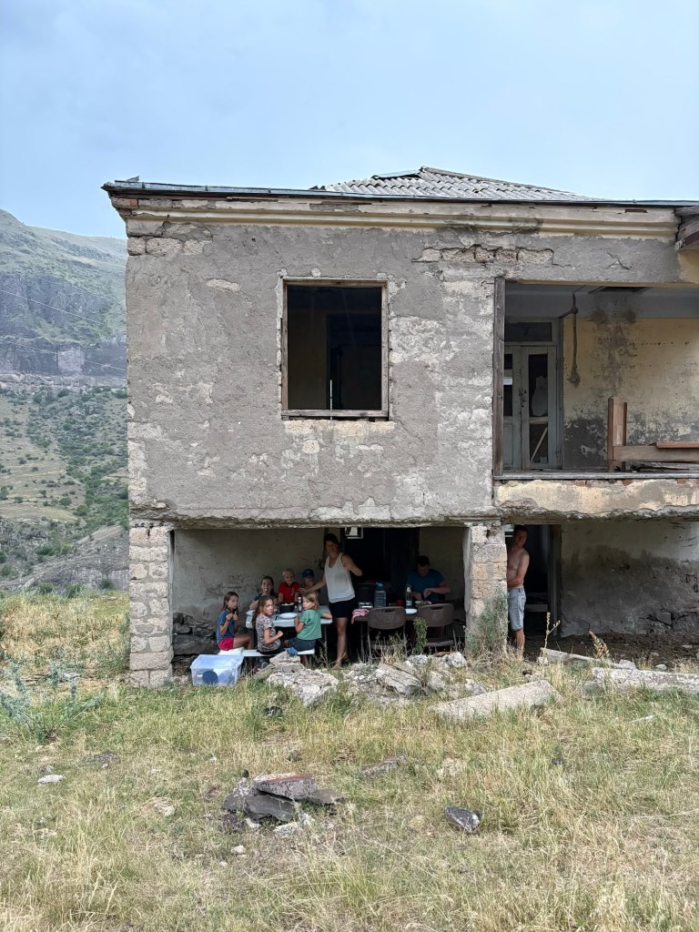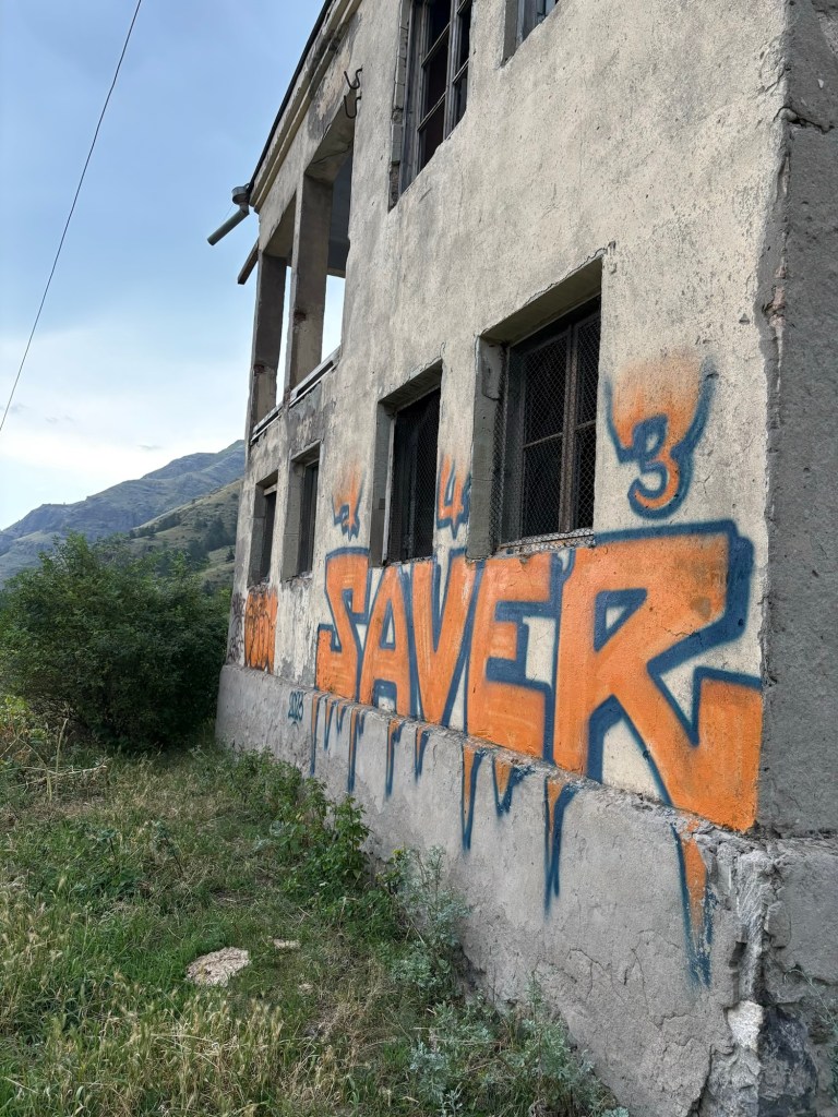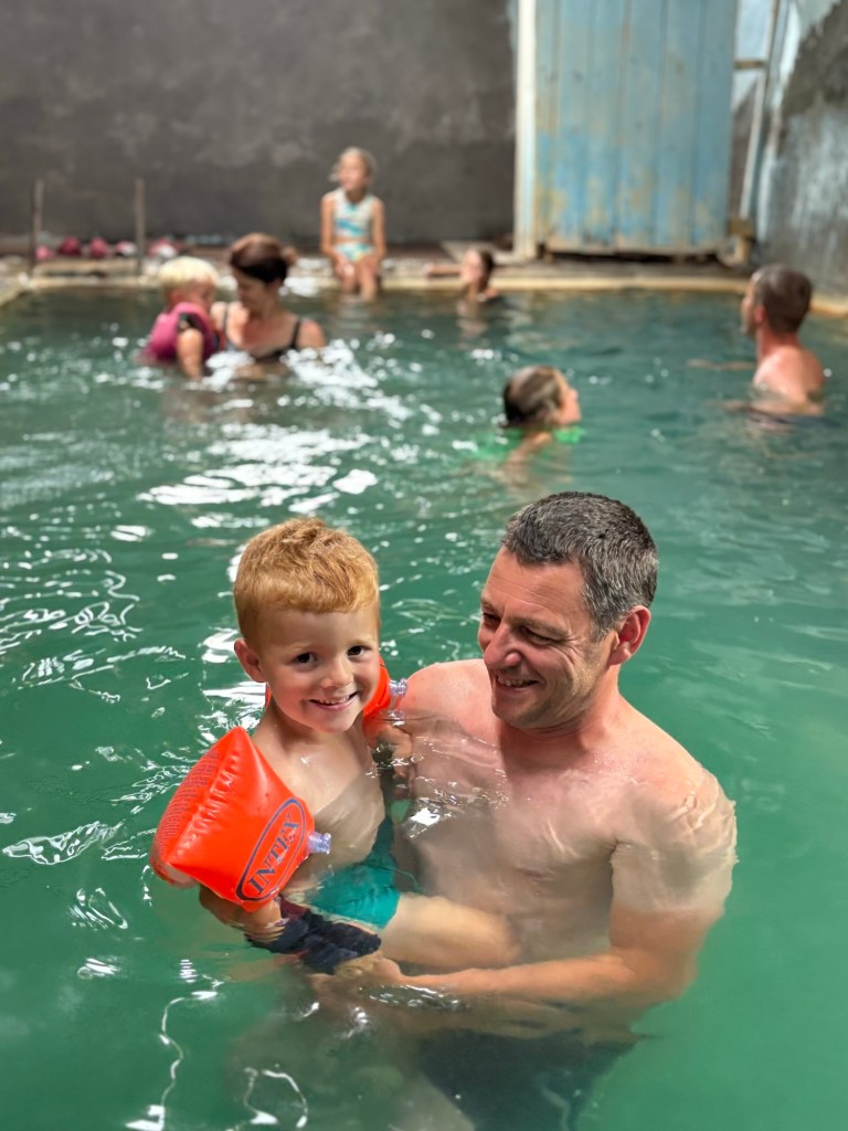 Ons boek zei dat je open-minded moest zijn voor het volgende avontuur en effectief. De auto sloeg af aan een grote witte waterspuitende pomp en we reden tussen vervallen gebouwen richting de rivier. Maar daar wachtte iets totaal anders dan je zou denken. Hot springs in een oude stal is eigenlijk de beste beschrijving. De telefoonnr van de eigenaar staat op de deur. Wij moesten hem gelukkig niet opbellen, hij was er net voor een andere familie. Maar je zou t begot nooit zelf ontdekken! En zonder kennis van Georgisch en Russisch moeilijk te fixen activiteit…