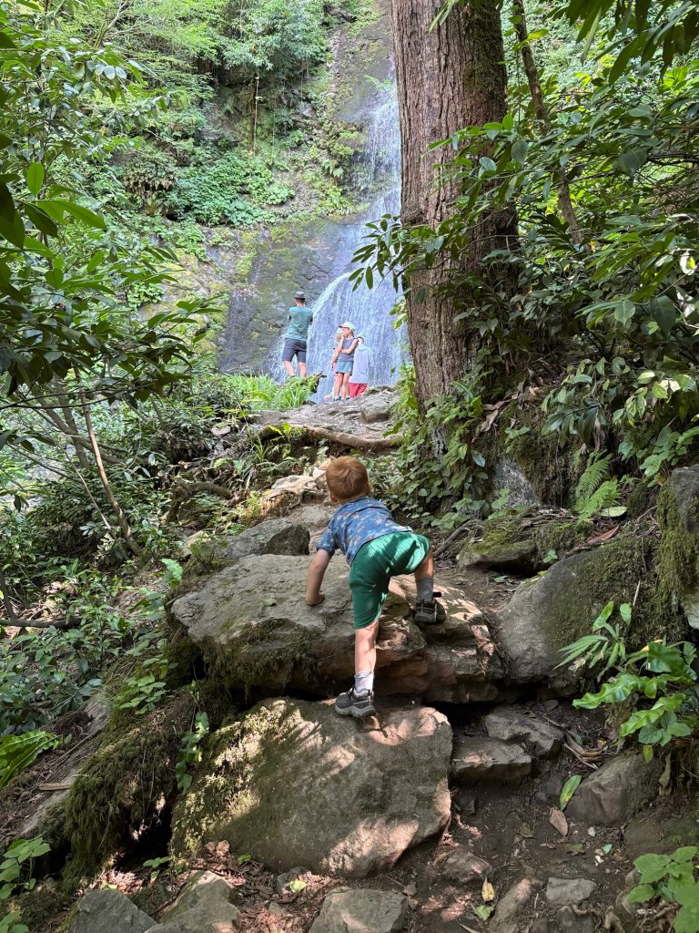 Nadien reden we 1,5u richting Mtirala National Park. Daar stond een wandeling van 5km op t programma naar een waterval. Op zich dit jaar een pak minder kilometers (iets met zwaardere Noah die nu voornamelijk zelf moet stappen wegens geen kine in de buurt om ons op te lappen als we eindigen met draagzak-verschot, maar ook… pittige hoogtemeters hier telkens dus kilometers zijn maar “een indicatie” van hoe lang we MIA zullen zijn 🤣)