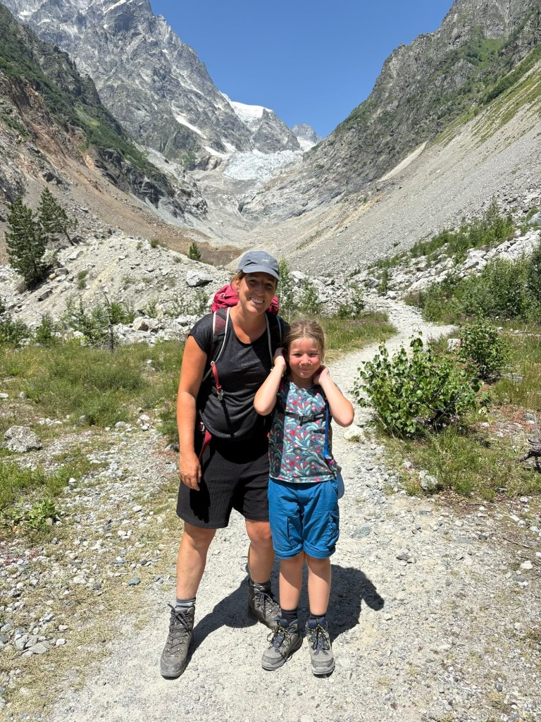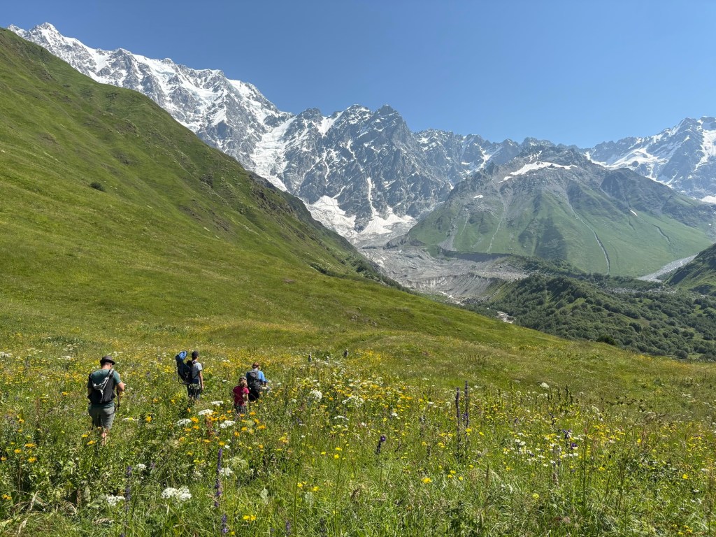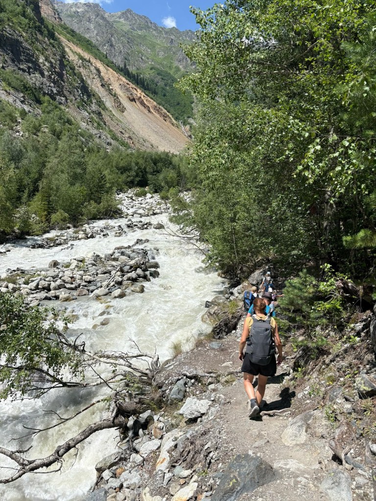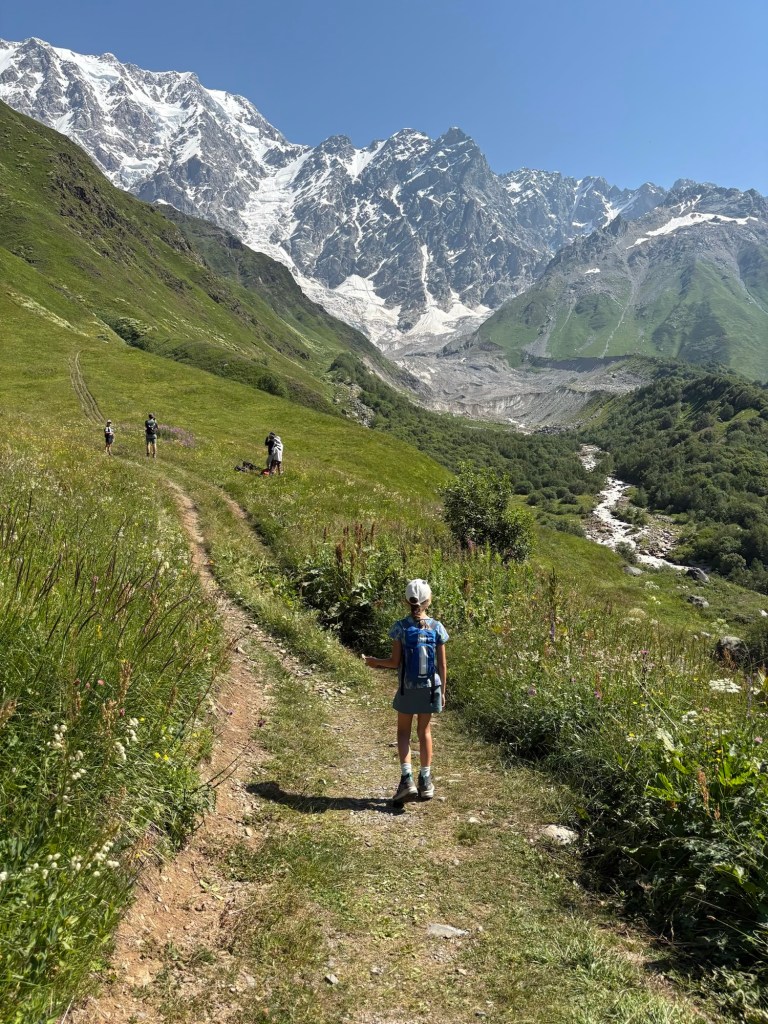 De dag begon met een uitdagende tweestrijd. Ons ene boek vermeldde dat je een border permit nodig had voor de uitverkoren wandeling, de Lonely Planet zei er niks van. Veiligheidshalve reden we toch naar de borderpolitie. Adres 1 gesloten, het backup plan “politiekantoor” gebaarde netelig dat we naar de “airport politie” moesten. En daar, iets buiten het centrum, snapten de mannen in uniform totaaaaal niet wat we kwamen doen & probeerden ze ons echt om te praten met hulp van een vrouw die moest tolken. Zogezegd mochten kids onder de 10j niet op de berg en ondanks onze deftige bergbotinnen zagen ze ons niet geschikt tot dergelijke wandelexpeditie. Uiteindelijk vonden we een compromis dat de hele groep tot de watervallen mocht & Tourguide Tine met Maarten en Christoph toestemming kregen om de Uschba gletsjer op te wandelen. Wederom waren we vertrokken voor wat bureaucratie. Eerst op zoek naar 3 balpennen, nadien de juiste schuif met papiertjes, alles invullen en tot slot het geschikte nietmachine om de papieren samen te houden en weer ergens in een andere kabinetschuif op te bergen. We know the drill 🤣