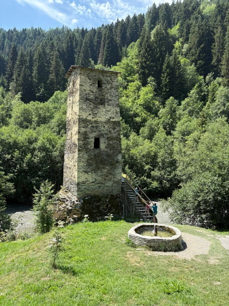De route was vroeger een dagvullend programma en ook in ons boek stond ze nog als 4×4 route maar ondertussen is ze helemaal geasfalteerd en rij je vlot buiten op een paar passages waar er gewoon een rijvak weggespoeld is of ze herstellingen uitvoeren. Het vorderde vlot en ondanks dat we stopten bij de Tower of Love (5gel ons gezin, normaal 2 pp) stonden we in Ushguli voor we t wisten. Opnieuw een gehucht vol met de kenmerkende uitkijktorentjes.