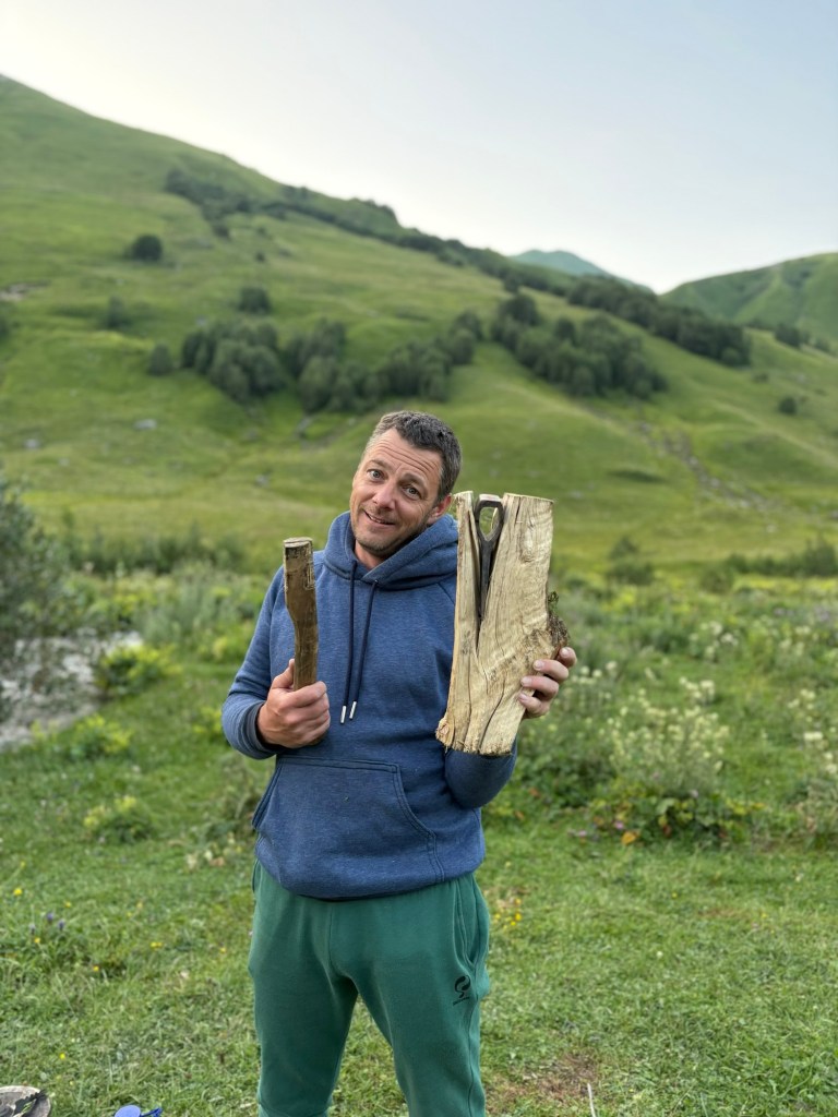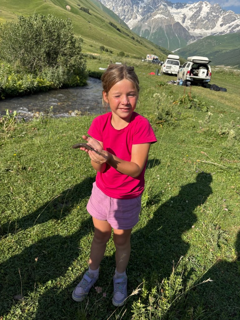 Overnachting: tal van plaatsjes voorbij de aangegeven wildkampeerplek op de route. Wij kozen aan een kleinere zijarm van de rivier die uiteraard even koud was maar wel toeliet dat we een beetje gingen pootje baden. Eigenlijk kan je de hele route tot aan het Doshdul Shkhara cafetje bij de start van de wandeling gebruiken en we kwamen zelfs moedige 4×4 rijders tegen die nóg verder gereden waren en de route naar het plateau boven de rivier opgesjeesd waren.