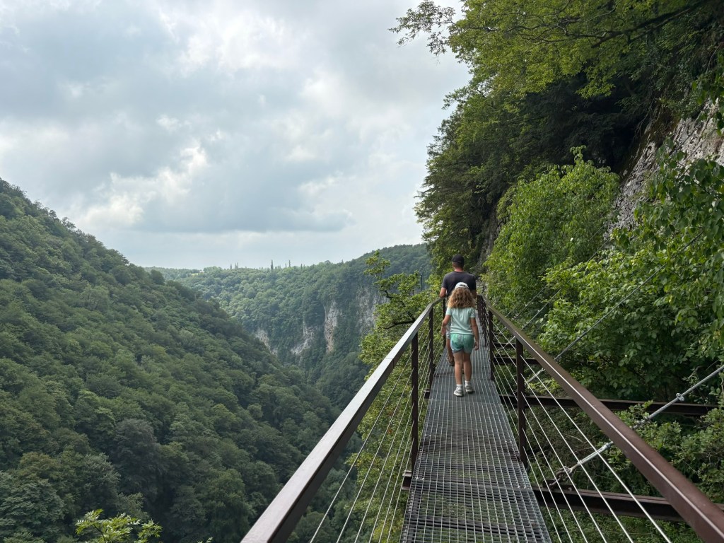 Allereerst reden we naar Okatse canyon. tegenvallerke, kids onder 1m20 mochten niet mee. Gelukkig konden we met onze 4×4 zelf naar het beginpunt rijden en ontsnapten we aan de taxi-tourist trap. Echt, een groot bord met verboden voor auto’s en lag daar een asfalten baan die breder aangelegd was als menige zandhobbelweg in een standaard Georgisch dorp. Uiteindelijk bleef Stefanie bij de jongens terwijl de rest van onze groep de canyon wandeling in ging (20gel per volwassene / 5,5 gel per kind 6-18j)