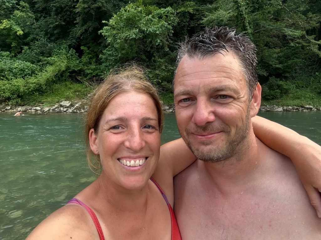 Overnachting: Wildkampeerplek rechts van de voetgangersbrug op gps coördinaten 42.3962238, 42.2329691 – ideaal rivierzwemmen want nergens super diep!