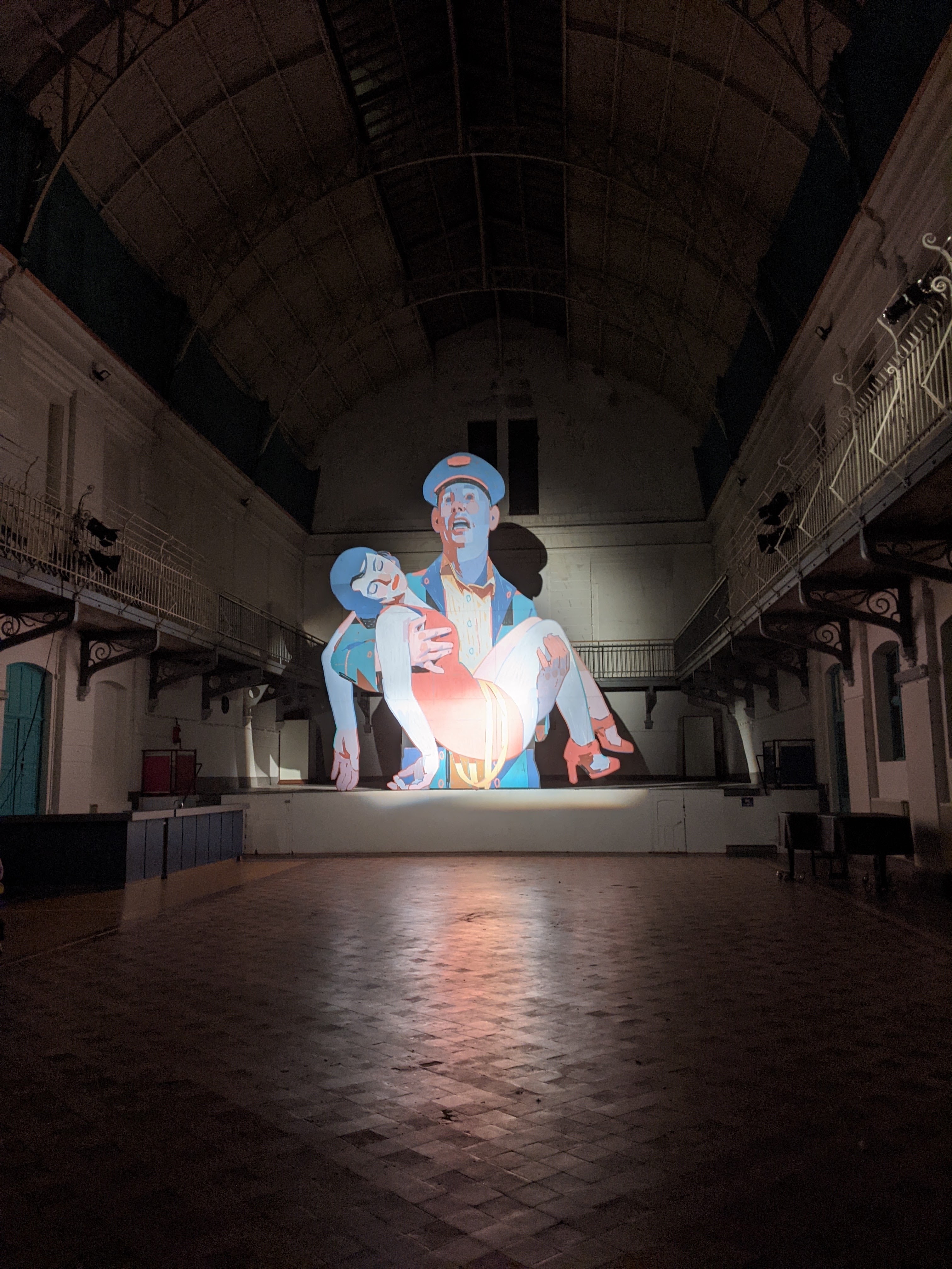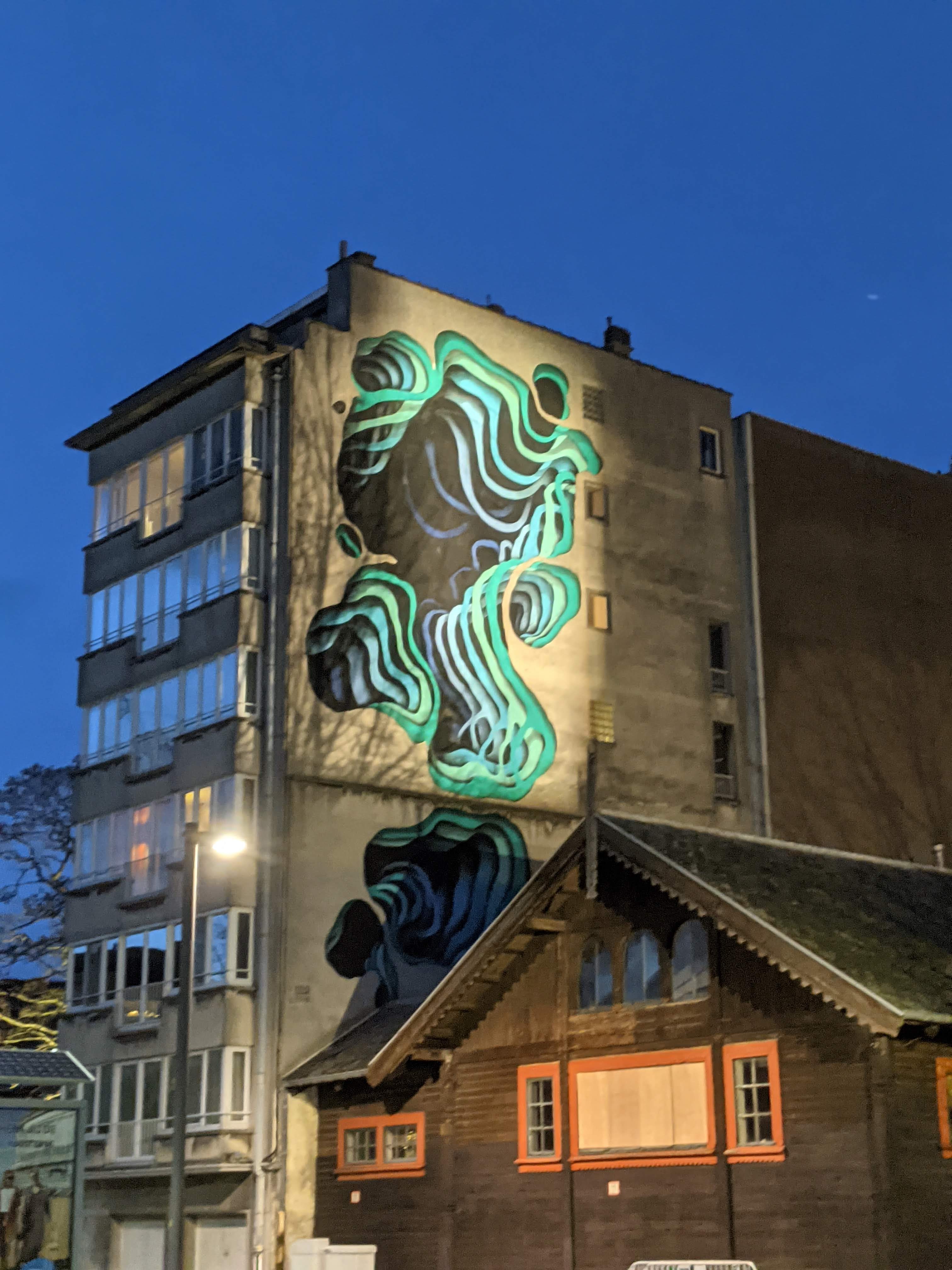 Na wat omzwervingen kwamen we aan bij de lichtinstallatie van Marina Zumi, een Argentijnse, geïnspireerd door de technoscene van de duitse hoofdstad Berlijn waar ze woont. Ze ontwerpt surrealistische lichtinstallaties – die gecombineerd met haar streetart ervaring – een parallelle wereld creëren in neon die je doet vloeken op de groepjes mensen die fotobommen hebben als hobby. Een securityagent later die beleefd maar kordaat het éénrichtinsgverkeer binnen de lichtinstallatie duidde, stonden we – met het idee van hier komen we straks wel terug – aan de installatie van 1010. Voor The Crystal Ship maakte 1010 reeds in 2016 een werk uit The Loch (Hole) Series. Toen de syndicus van het gebouw het ontwerp zag, vroeg hij of de kunstenaar nu ging boren of schilderen op zijn woning. Het zou moeten een poort voorstellen naar een andere wereld… ikzelf zag er eerder een knap gefigureerde en gestileerde zwarte vrouw in met lange appelblauwzeegroen gekrulde lokken.