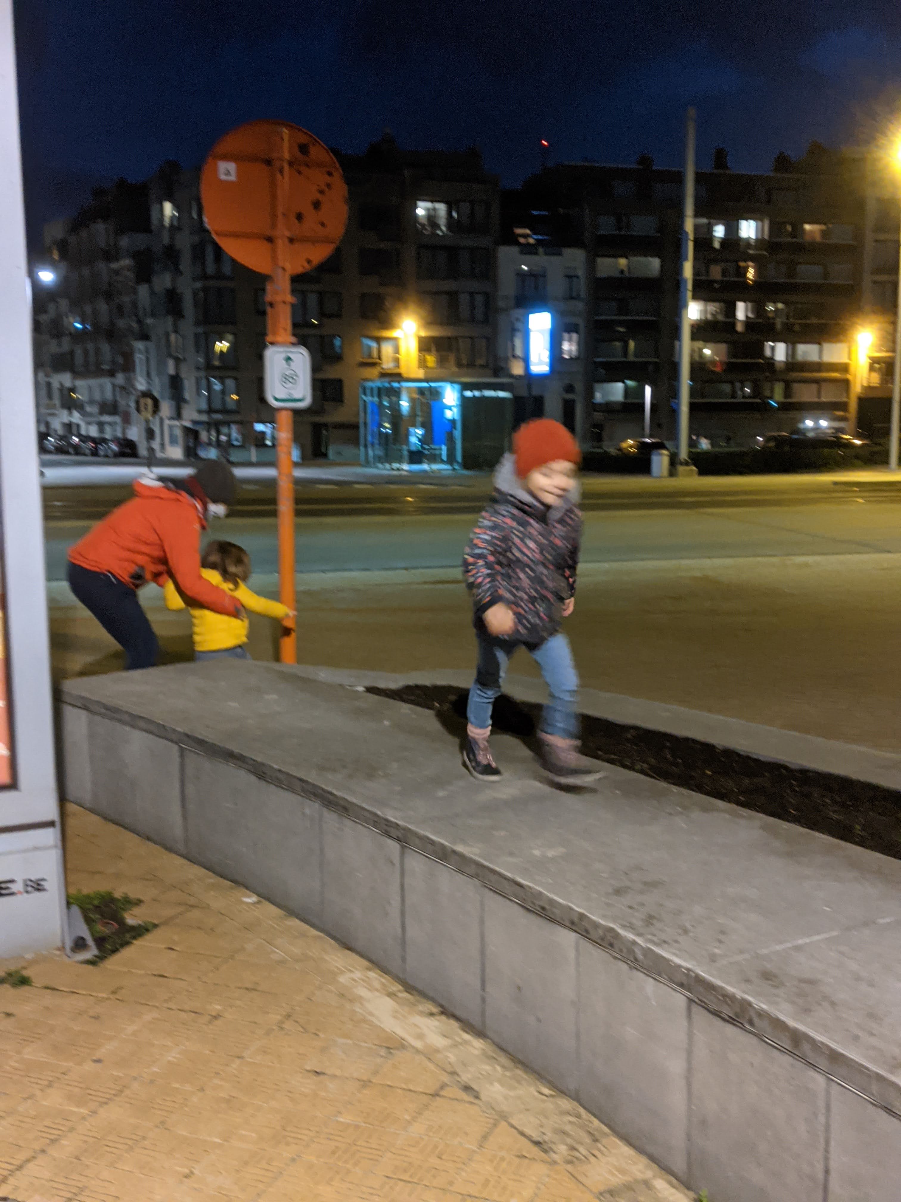 Na ongeveer een dik 1,5u ploeteren en ons eerste koekje, een wildplaspauze – waar ons meiden ondertussen zo pro in zijn dat ze ook totaal geen graten zien om temidden een stad te denken dat elke voortuin-boom dienst kan doen om eventjes beschut pipi te doen 🙀 – en veel gestap en gesleur later bereikten we t kanaal waar het tijd was voor onze warme chocomelk. Leve cécémel en enkele thermosjes!