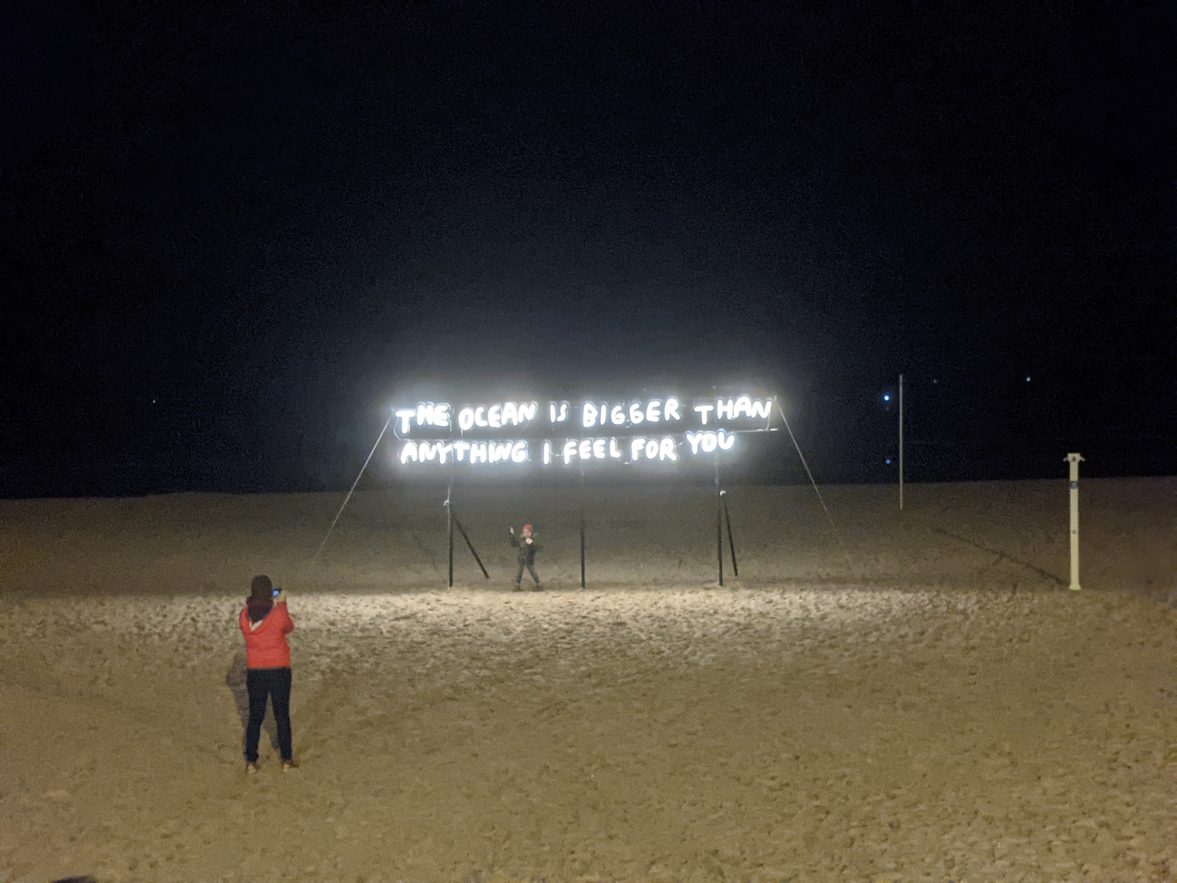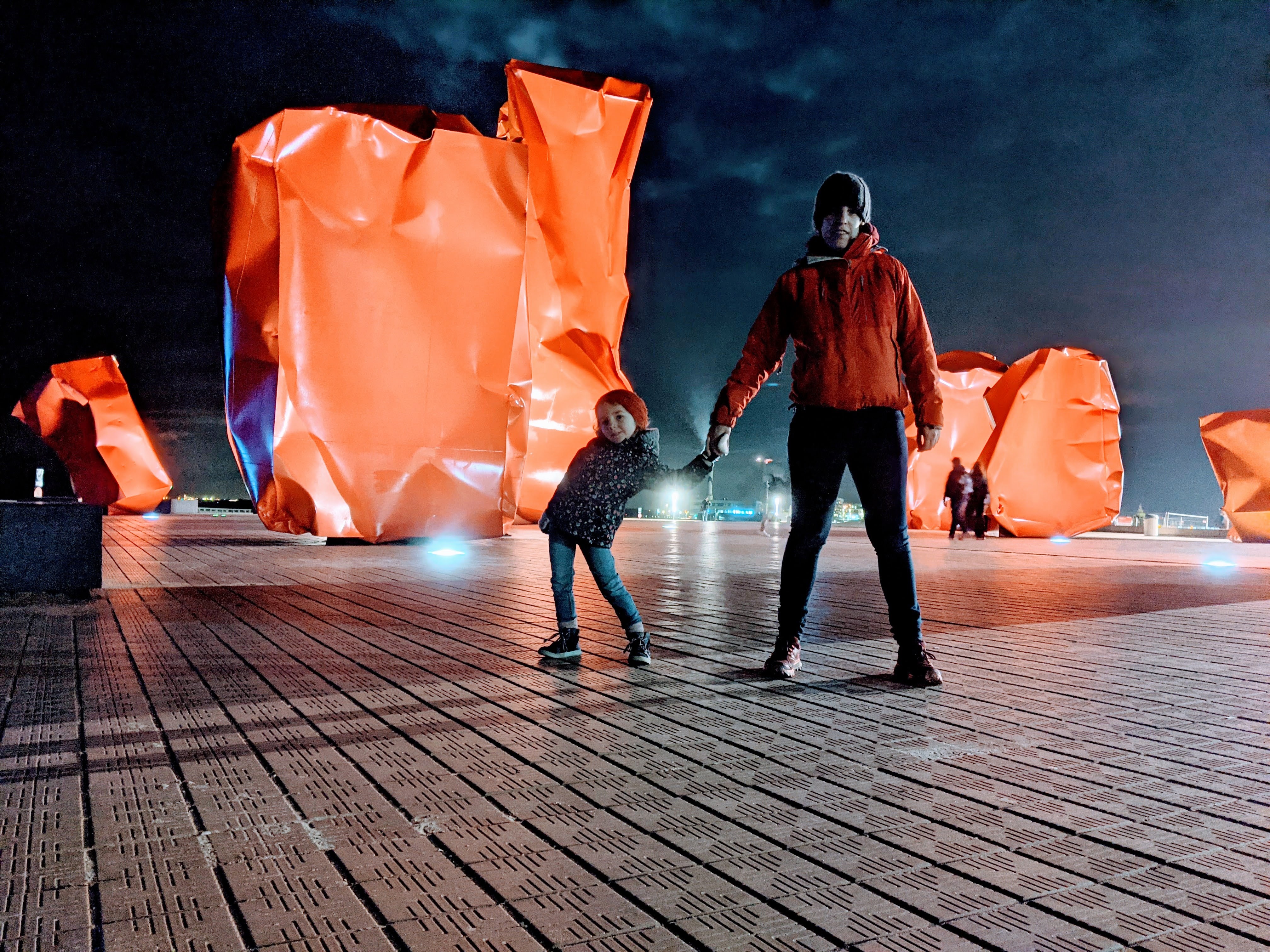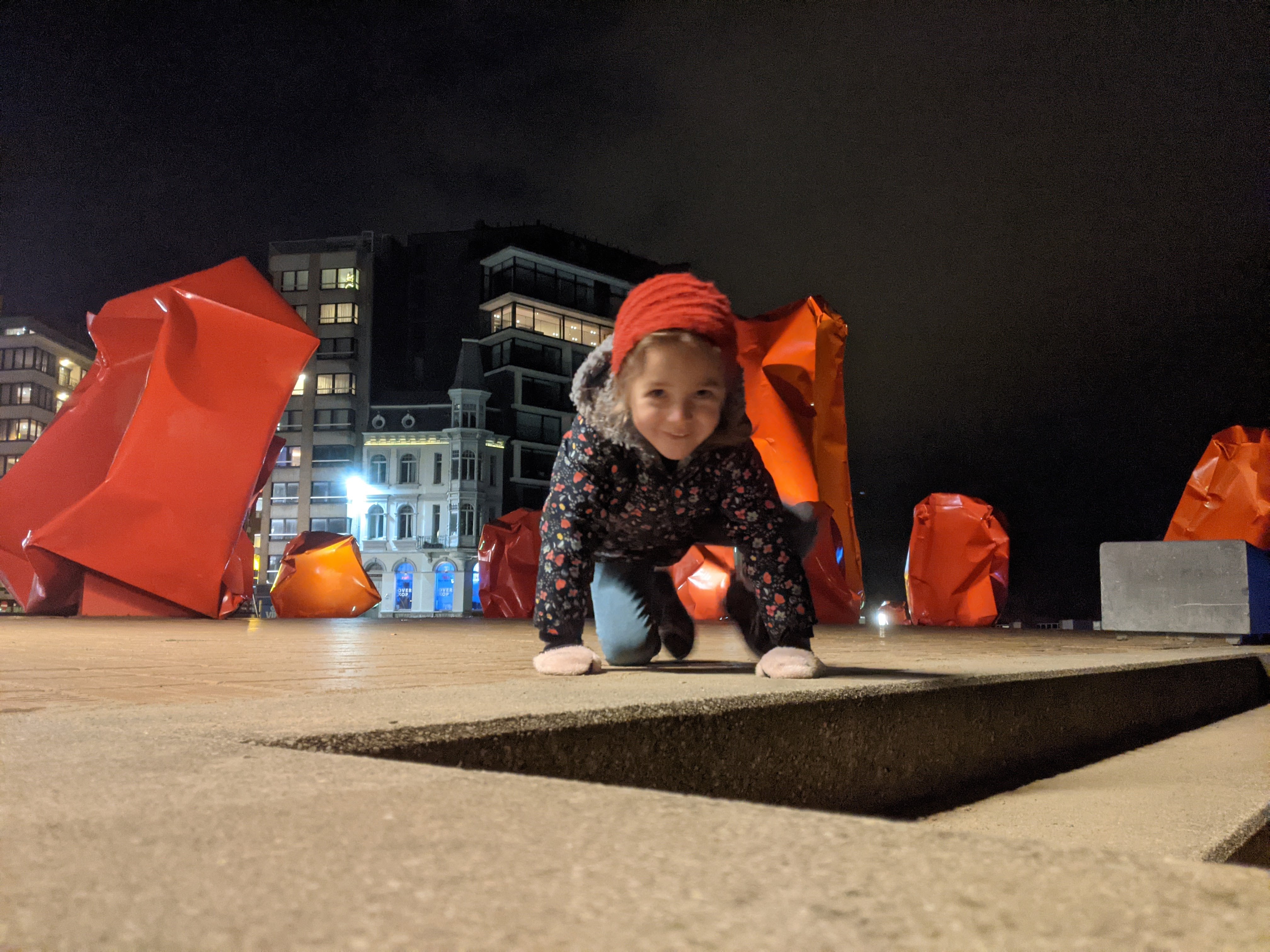 Na het parcours van onze twee dochters – de stad Oostende en haar straatmuebilair zijn vanavond onze speeltuin – bevonden we ons in de Japanse tuin aan het zwembad van Oostende. Het artiestenduo Lena Daems en Frederik van Remoortere speelden hier met videoprojectie en audio om een huis te laten openbarsten door middel van het opblazen van een bal. Zo willen ze ons laten nadenken wat het is om een ‘(t)huis te hebben’. Ik herinner me voornamelijk dat het eerst klank zonder beeld was omdat we te laat waren gezien een dochter noodgedwongen uit de buggy moest hangen om naar de lichtslinger te kijken…. ik begrijp het nadenken van de artiesten over het (t)huis hebben en laten wel…