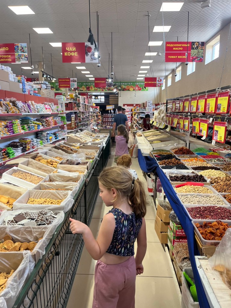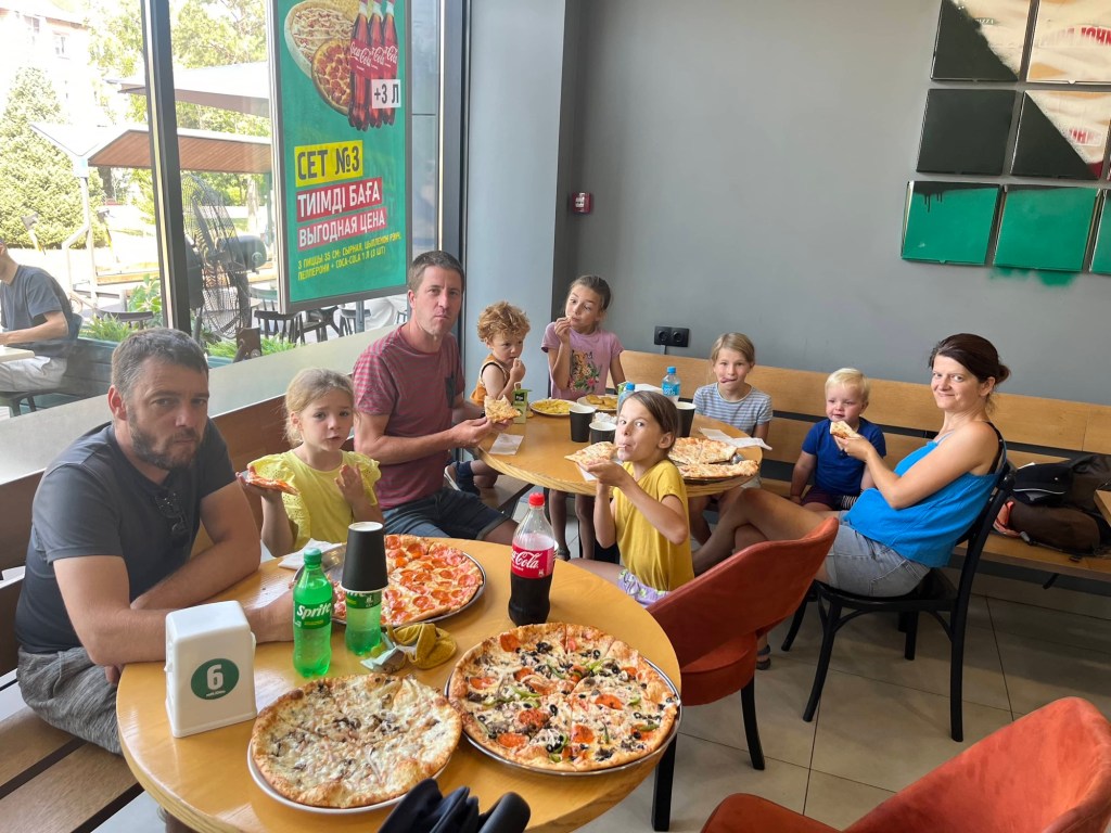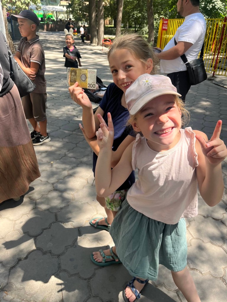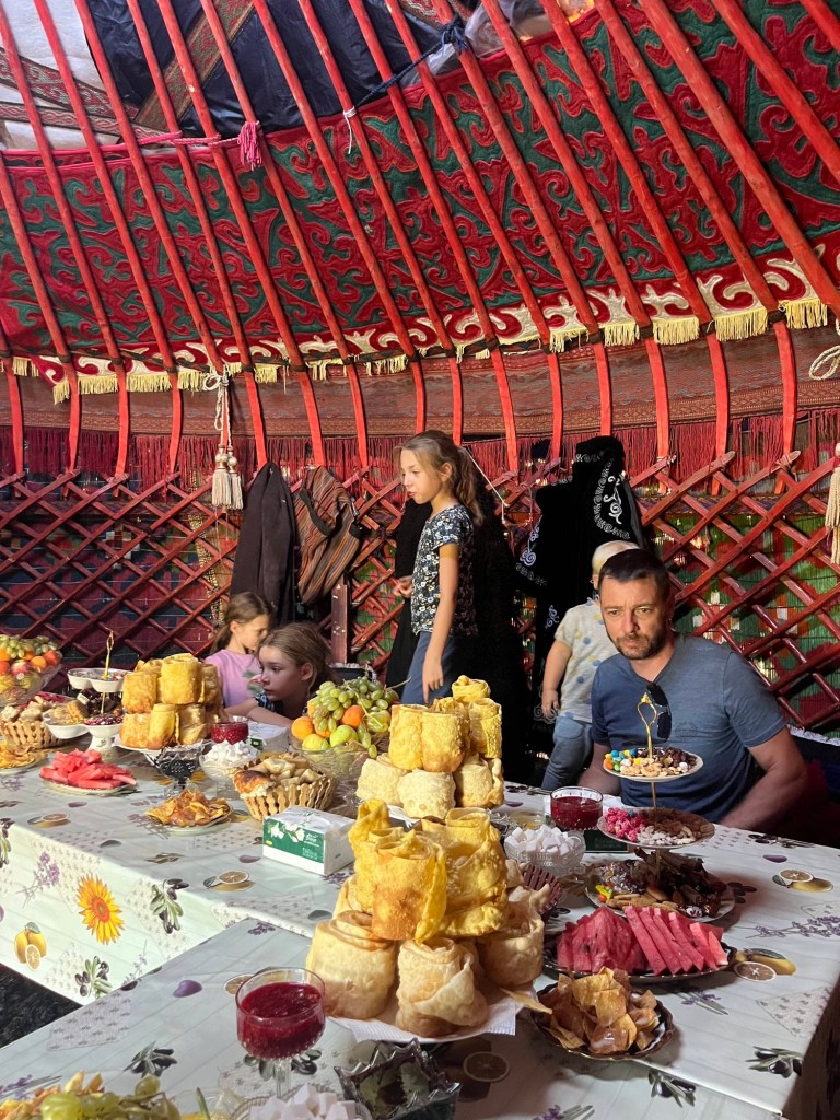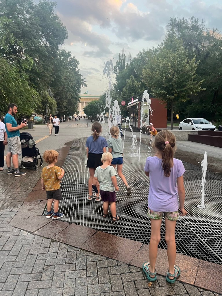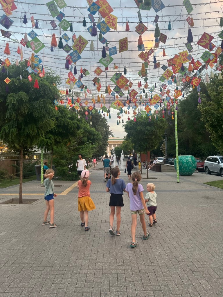 De rit naar Almaty was nog een paar uur en duurde verdacht lang doorheen de stad (file!) maar dankzij het vooruitzicht van een reeds goedgekeurd appartementje en aperitieven met onze vrienden, bleven we doorperen! De kids genoten van wat schermtijd en donuts.