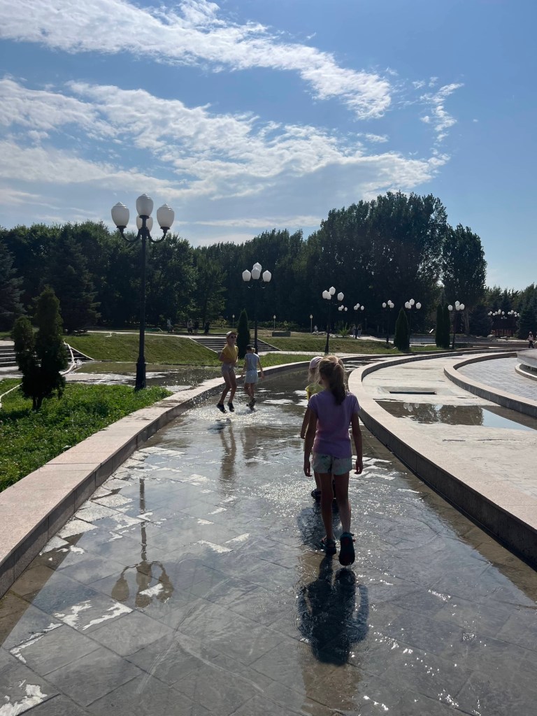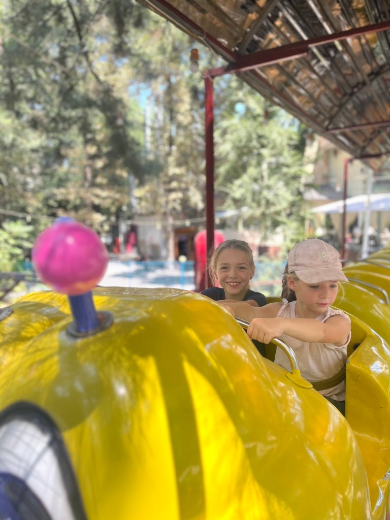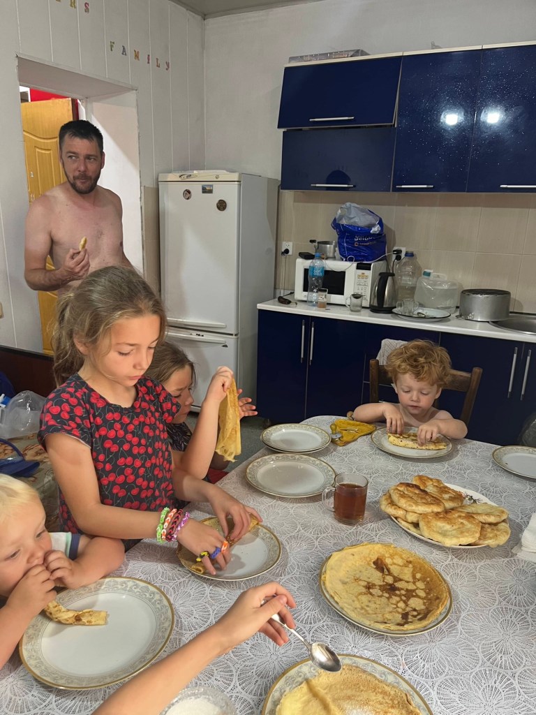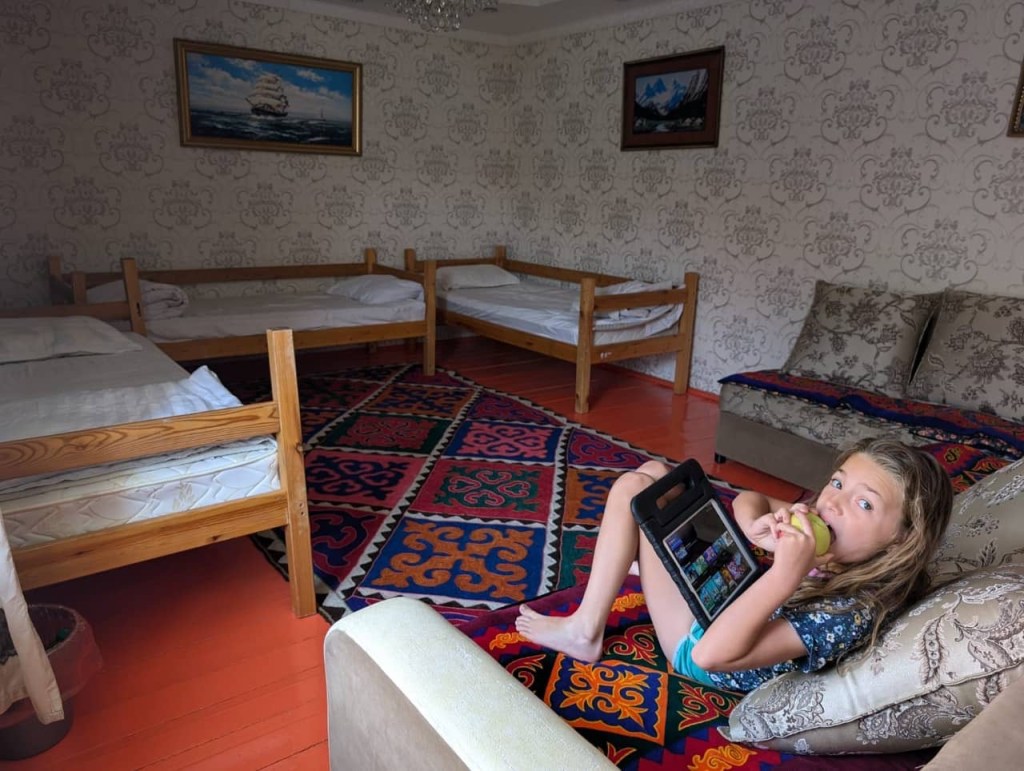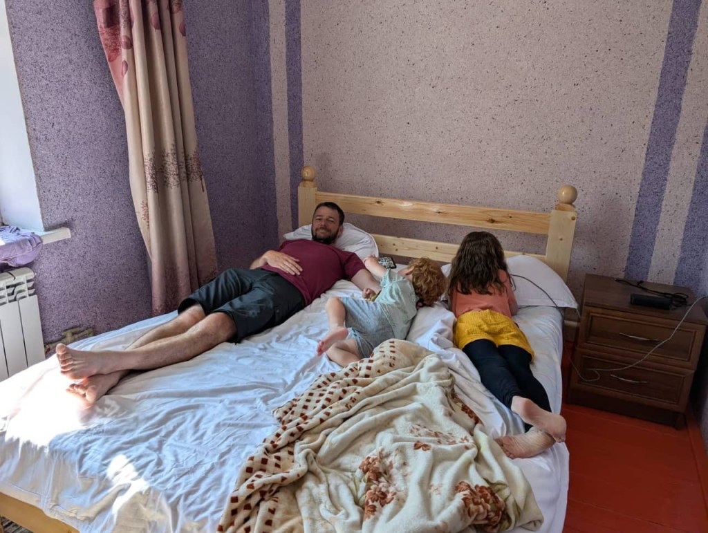 De rit naar Almaty was nog een paar uur en duurde verdacht lang doorheen de stad (file!) maar dankzij het vooruitzicht van een reeds goedgekeurd appartementje en aperitieven met onze vrienden, bleven we doorperen! De kids genoten van wat schermtijd en donuts.