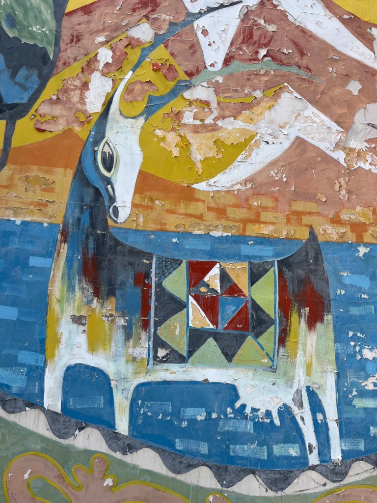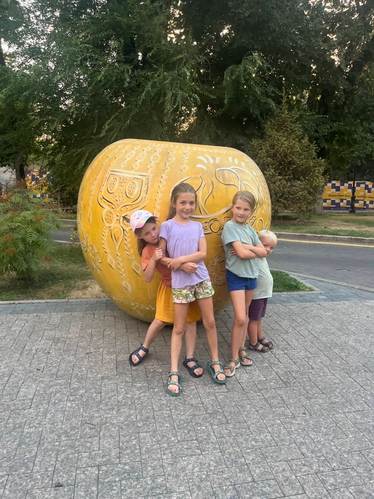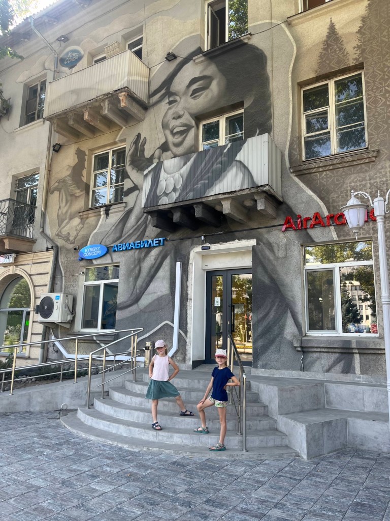 We aten bedenkenlijke fastfood en wandelden erna de ganse stad een paar uur verder door met als einddoel “samen laatste avondmaal”. De Persyns hadden er een drukke dag opzetten met een museum (waar geschiedkundig toch wat verzwegen tijdspannes het geheel ongeloofwaardiger maakten), de Kok Tobe kabelbaan (pokkeduur en nadien een half pretpark), de green market buurtmarkt etc. Wij waren best tevreden met de enkele murals en de Almaty appels 🤪.
