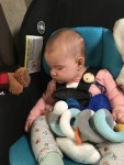 Ze is ongetwijfeld de allergemakkelijkste van de 2 op deze reis, buiten de vervelende gewoonte om steeds nog een laatste kakpamperke te produceren als ze al ingegespt zit in de autostoel, doet ze niets anders dan lachen, eten en slapen.