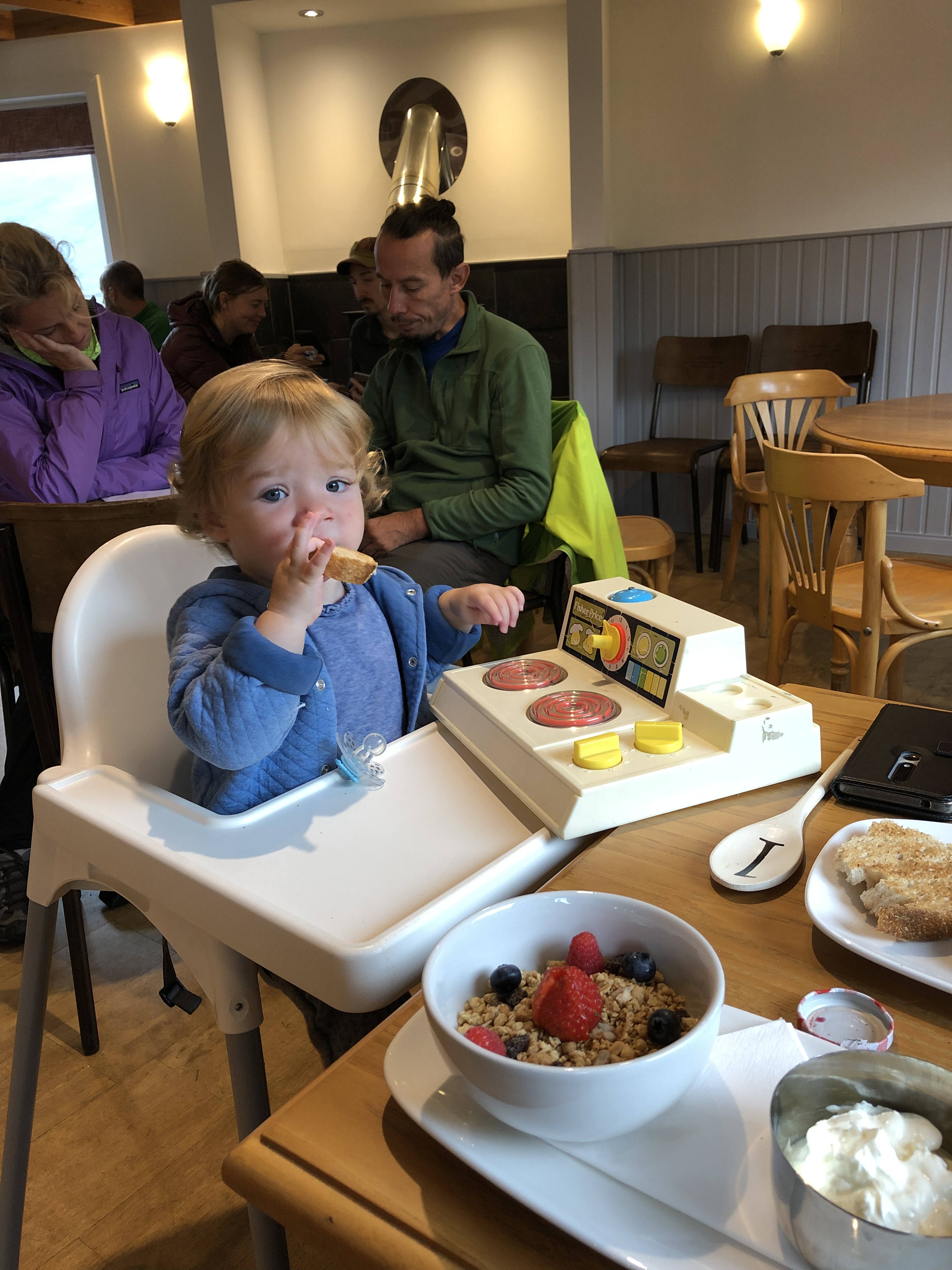 De buitensportwinkel was pas open om 10u op zondag dus wij erboven naar het koffiehuisje voor ontbijt👌🏻. Café Margot had zelfs een fisherprice keukentje en kassa om de kids te entertainen. En zalig veel koffie en thee om uit te kiezen en echt lekker ontbijt. Om 9u konden we nog uit zowat alle tafels kiezen, om 10.30 was t vechten en mensen wegkijken…