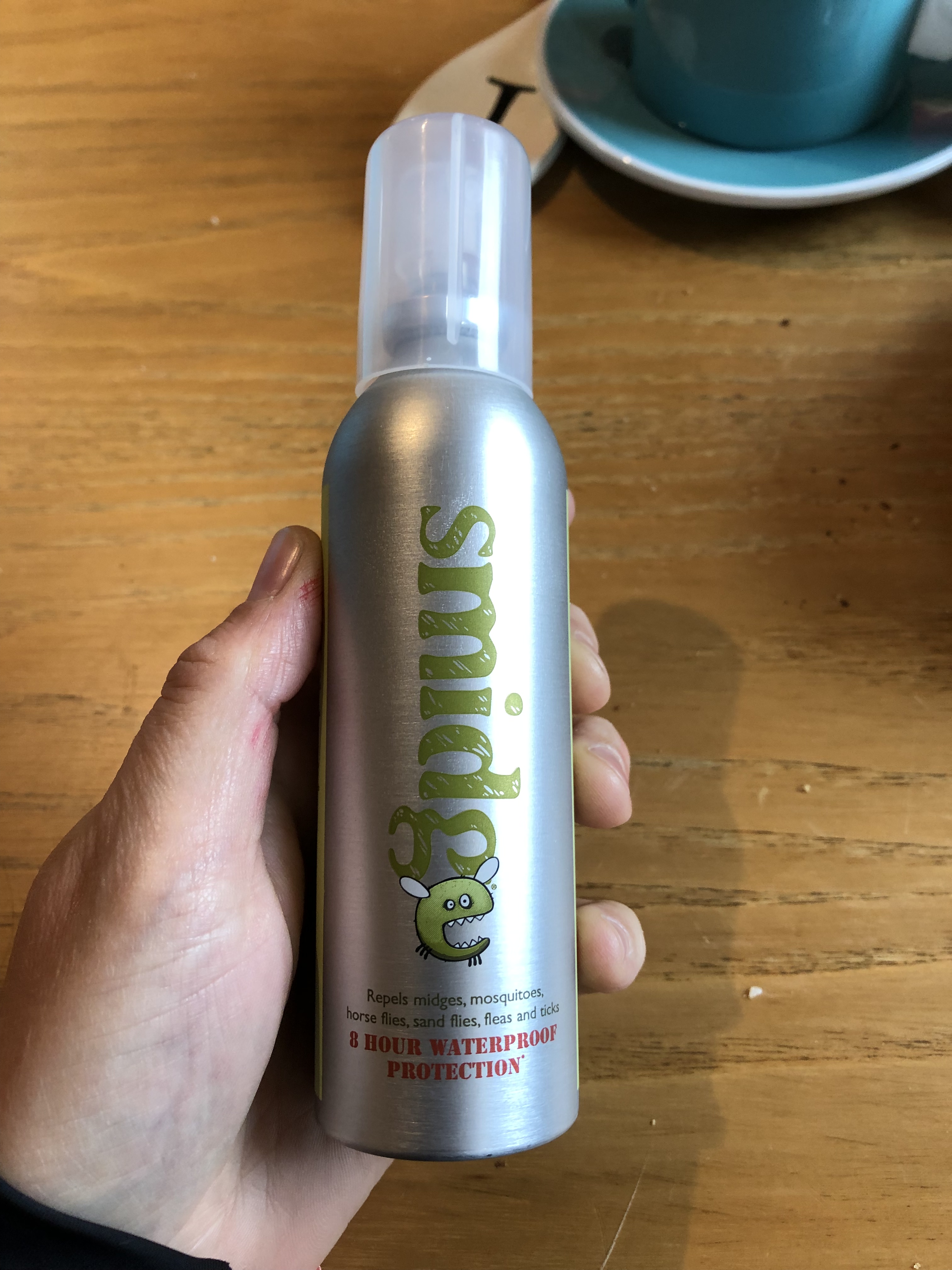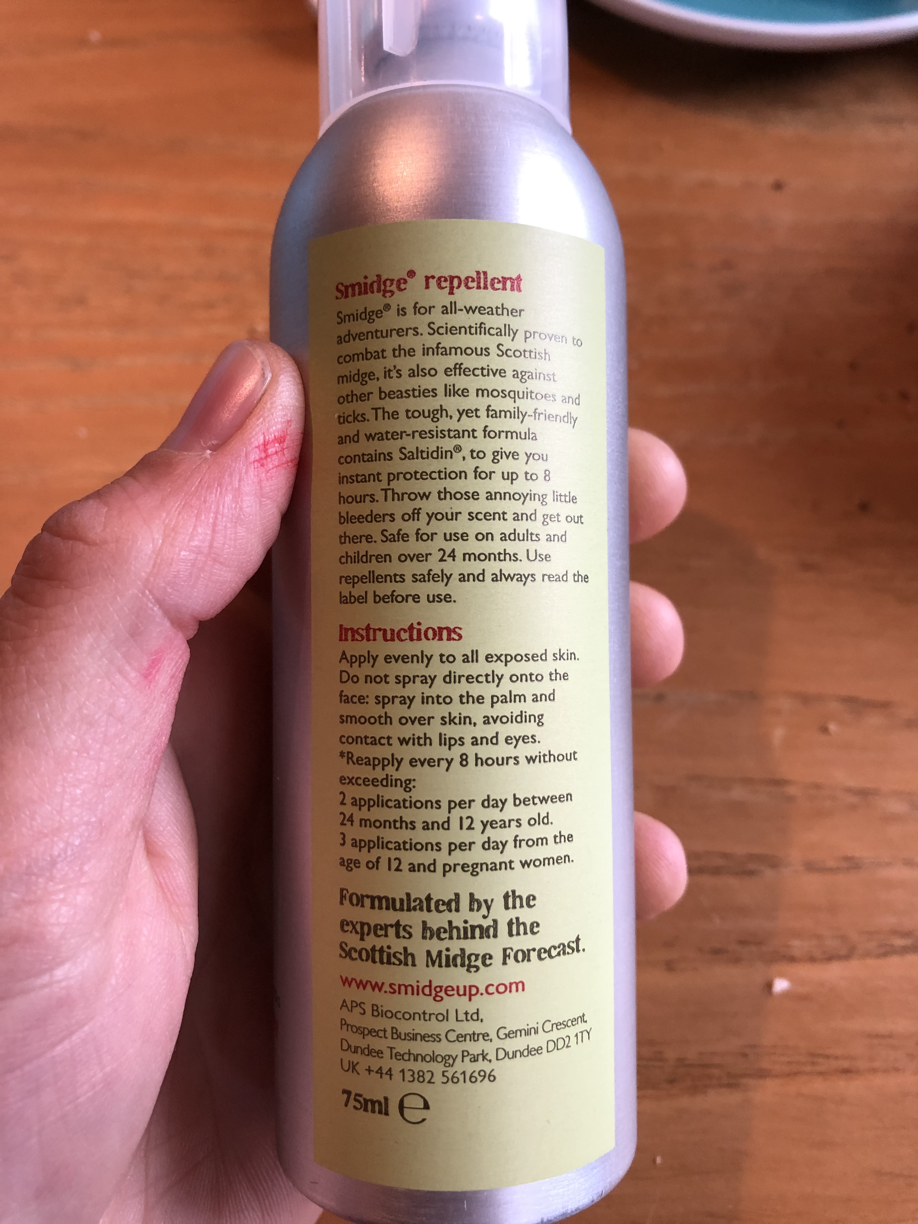 We werden in Ullapool zowat opgevreten door midges tijdens t afbreken van de tent dus besloten om alvorens te vertrekken toch “Smidges” ge kopen in de buitensportwinkel. Dat is samen met een muggennet dat eruitziet als een burka blijkbaar het enige dat helpt tegens die snertbeesten.