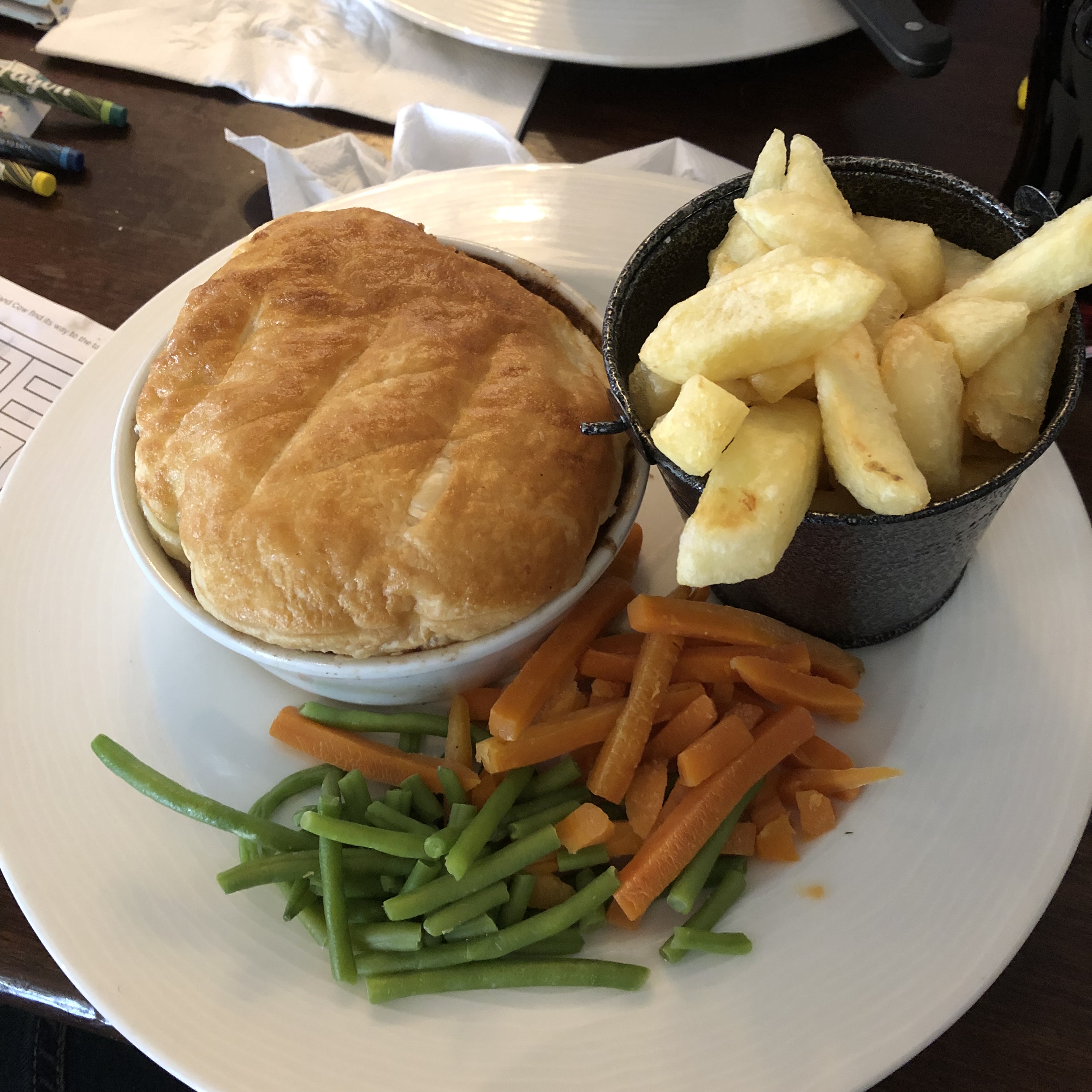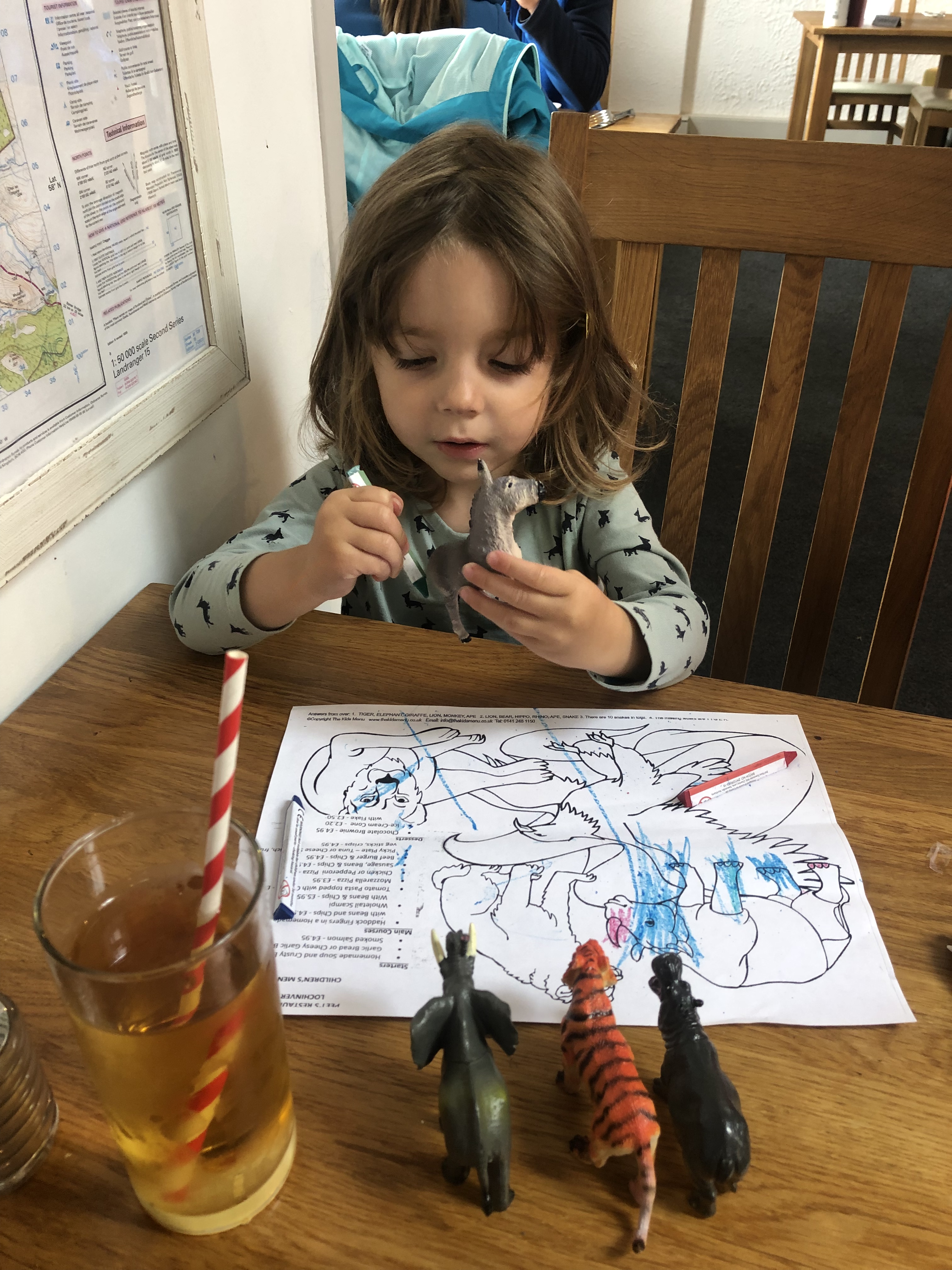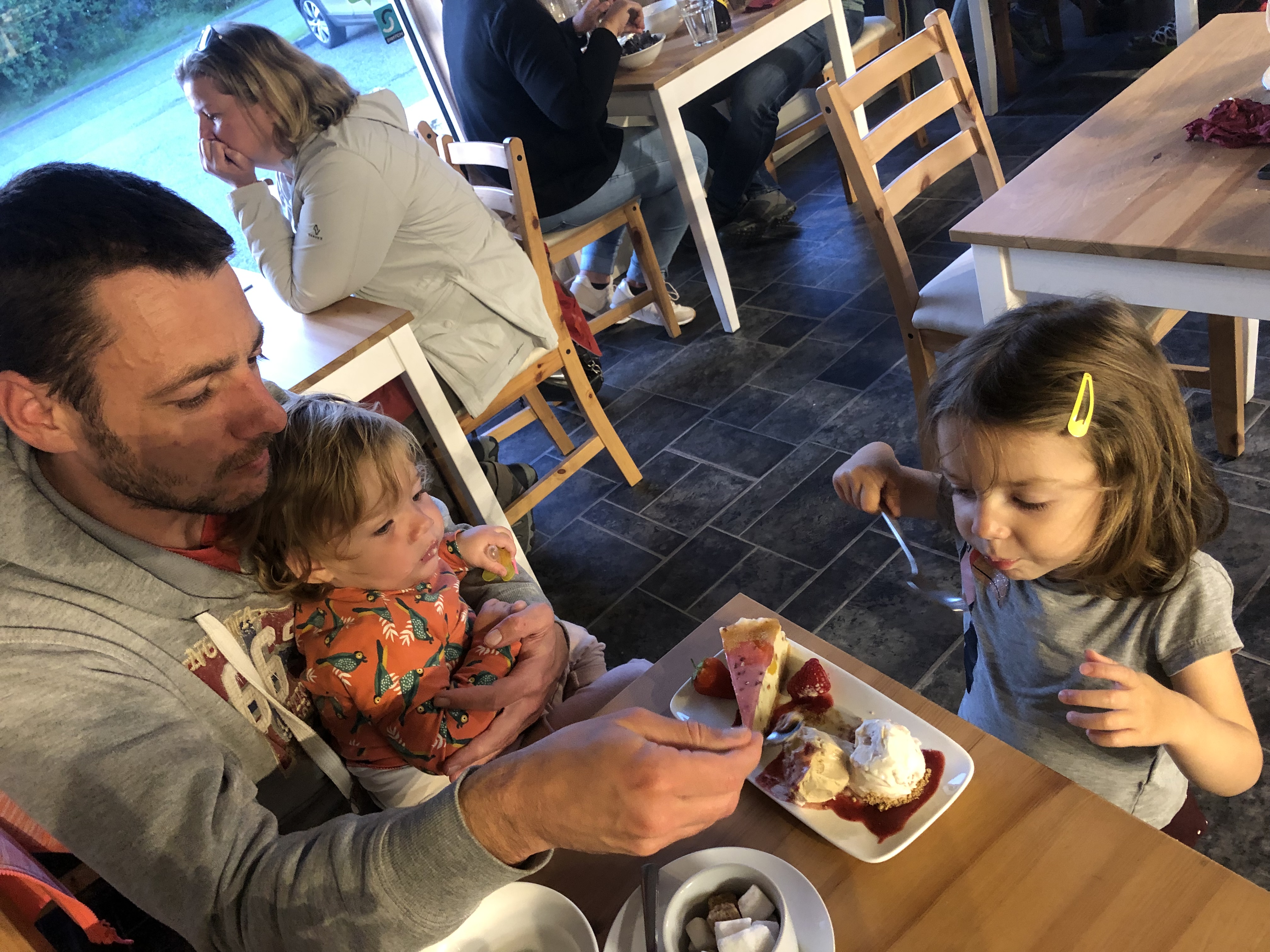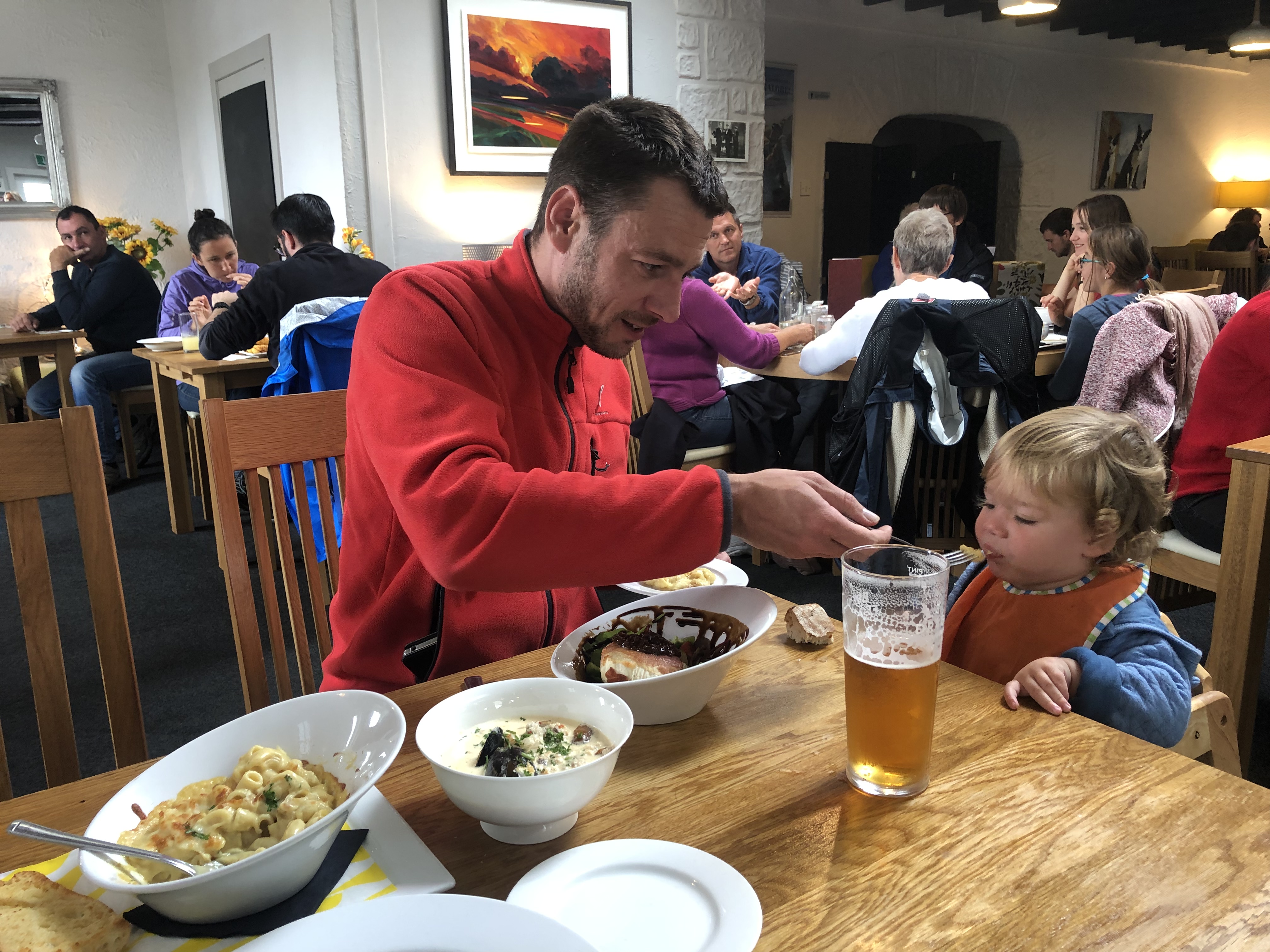 De eigenares raadde ons aan om nr de pub in t dorp te gaan eten. Na een dag auto zitten in de regen klonk dat wederom heerlijk. T was ook echt een classy restaurant met super lekker eten. En dat vonden Ava en Lia ook want in een wip waren de borden met puree en worst op. En dat gratis ijsje lepelde Ava rustig gans uit. Lia daarentegen brulde van enthousiasme telkens als Christoph net iets te traag was volgens haar 🤭