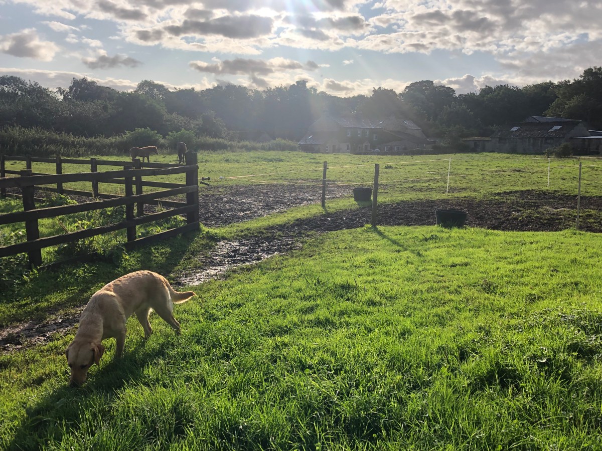 De labrador, Sally en Minnie en in de verte de boerderij en onze tentVeulen Sally en mama Minnie