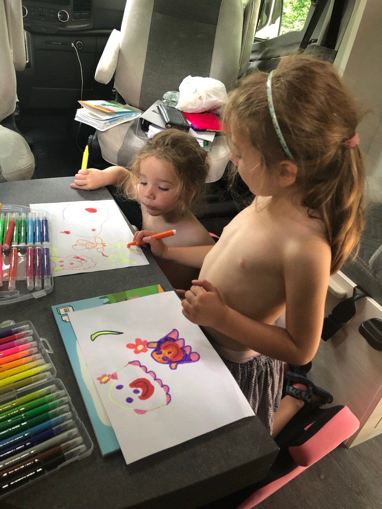 De kids leefden zich uit met hun nieuwe stiften terwijl moeder vanop bed eventjes met heimwee terugdacht aan die giga slide out mobilhome in USA/Canada waar de gootsteen groot genoeg was om uw afwas op te sparen, t kookvuur 4 plaatjes had waar onze pannen tenminste deftig op pasten en t bed niet half de living uit t plafond kwam zodat ge alles moest ombouwen…. Maar hej, wij waren sjansaars in een land dat gemaakt is voor dikke bakken en tourbussen 🤣 en geef me nog een dag of 2 om den deze verder in te richten en t voelt ook weer als thuis 😎