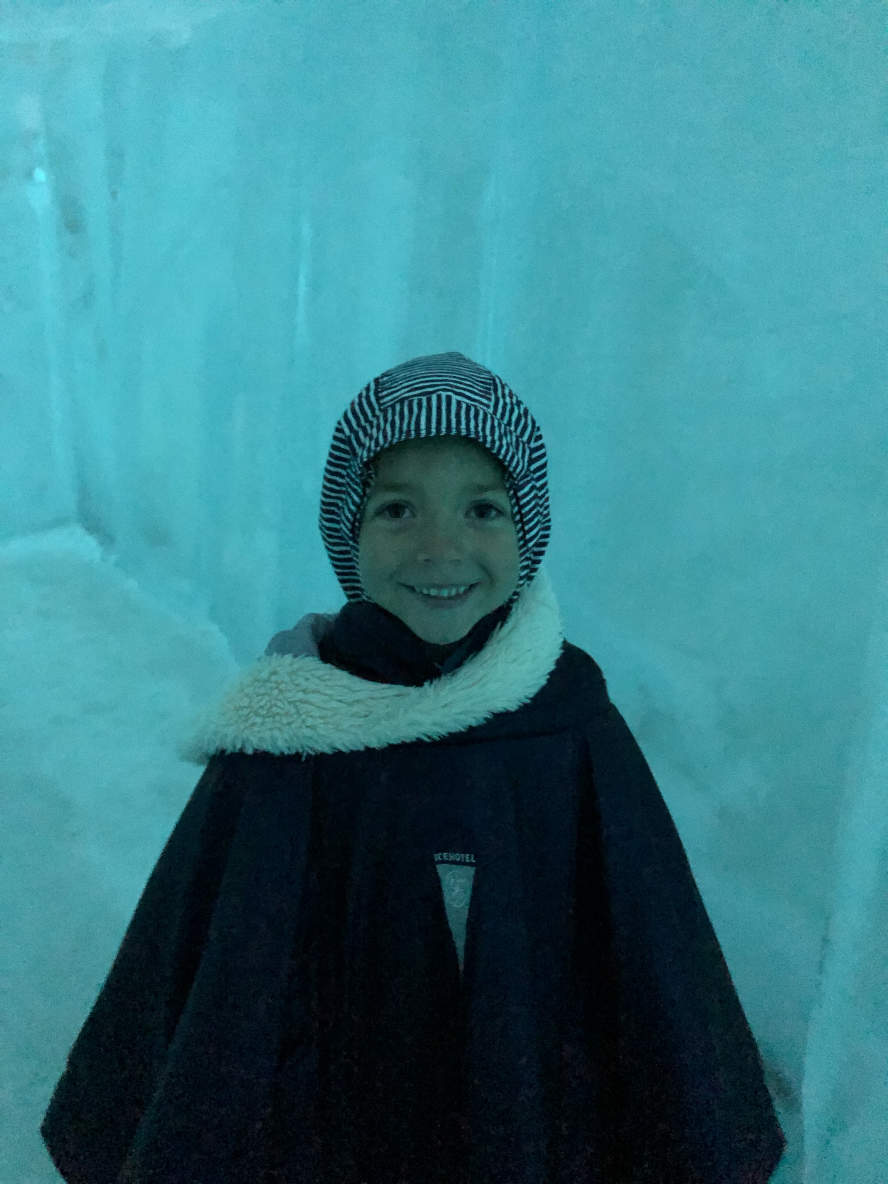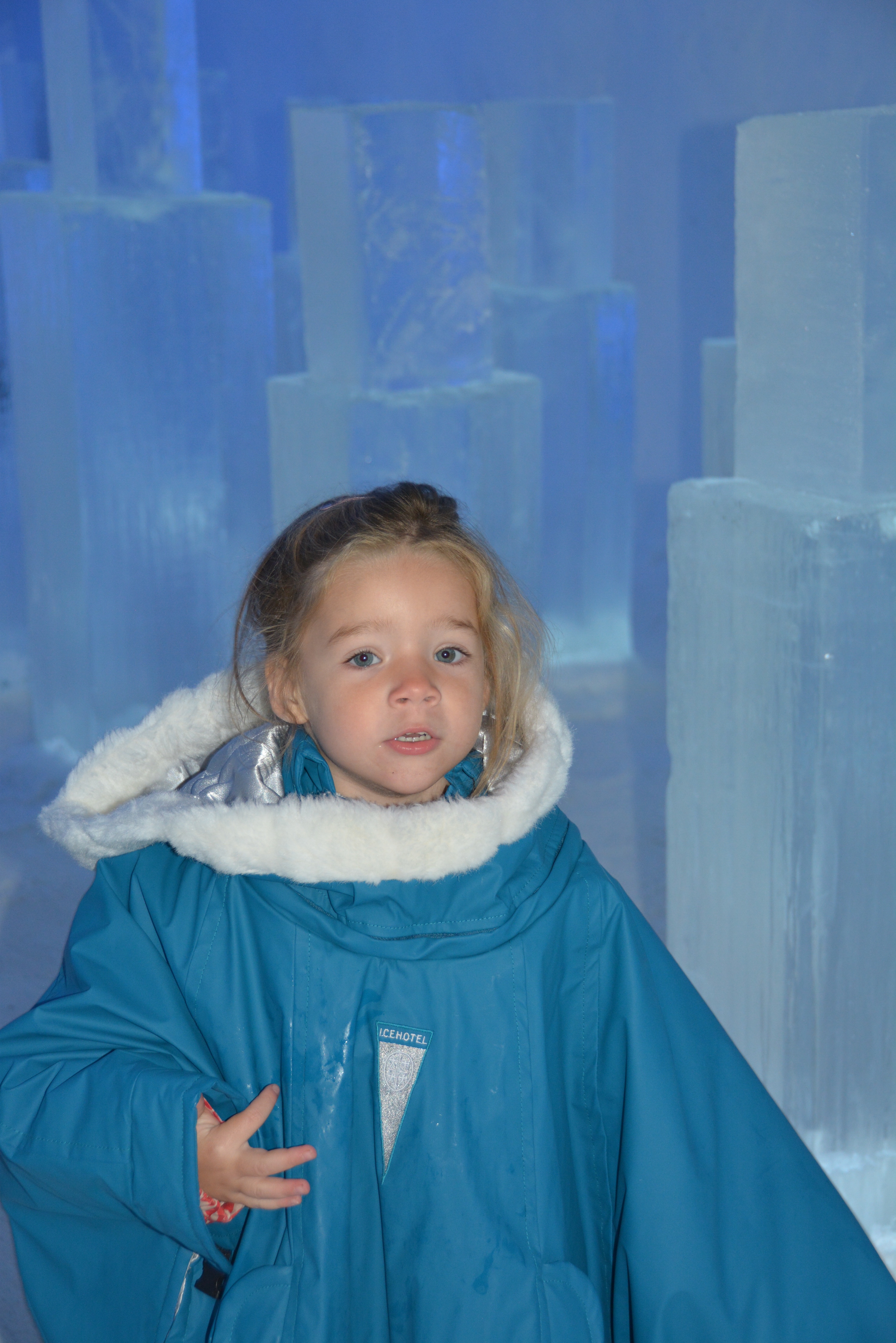 Na een omeletje als ontbijt stonden wij bij openingstijd (10u pas!) in onze warme kleren klaar aan t Ijshotel van Jukkasjärvi. Met 2 betalende volwassenen mochten de kids gratis mee binnen & we namen snel de enige kinder poncho die er was (minpuntje toch wel!).