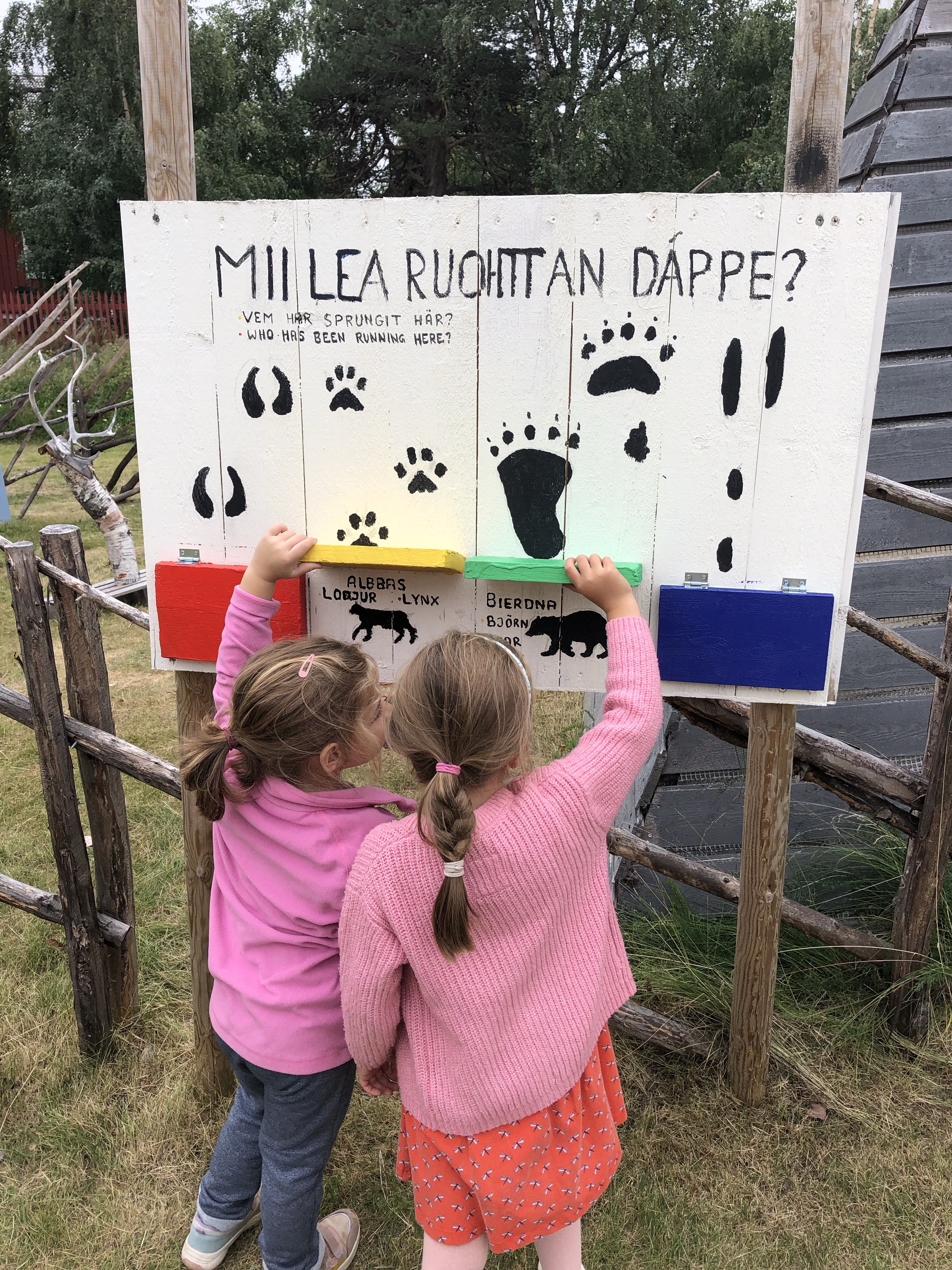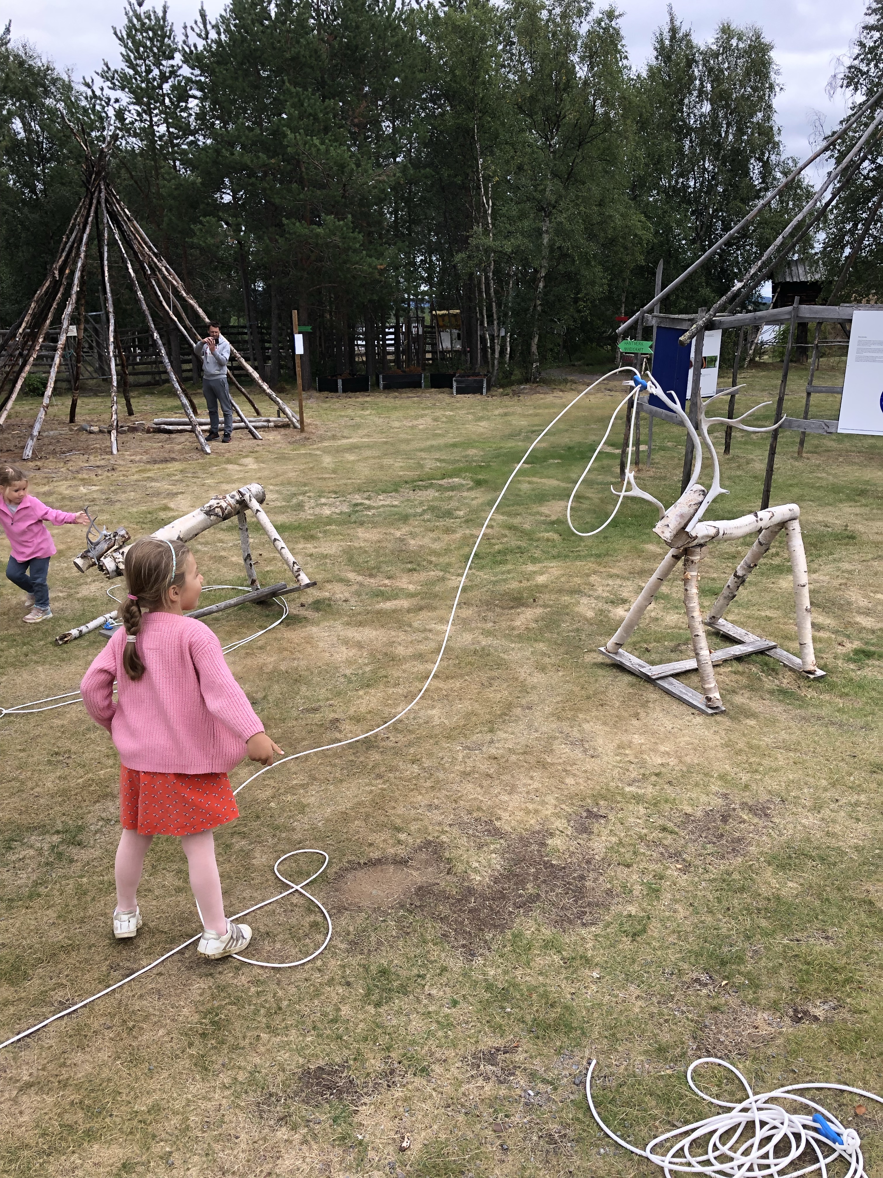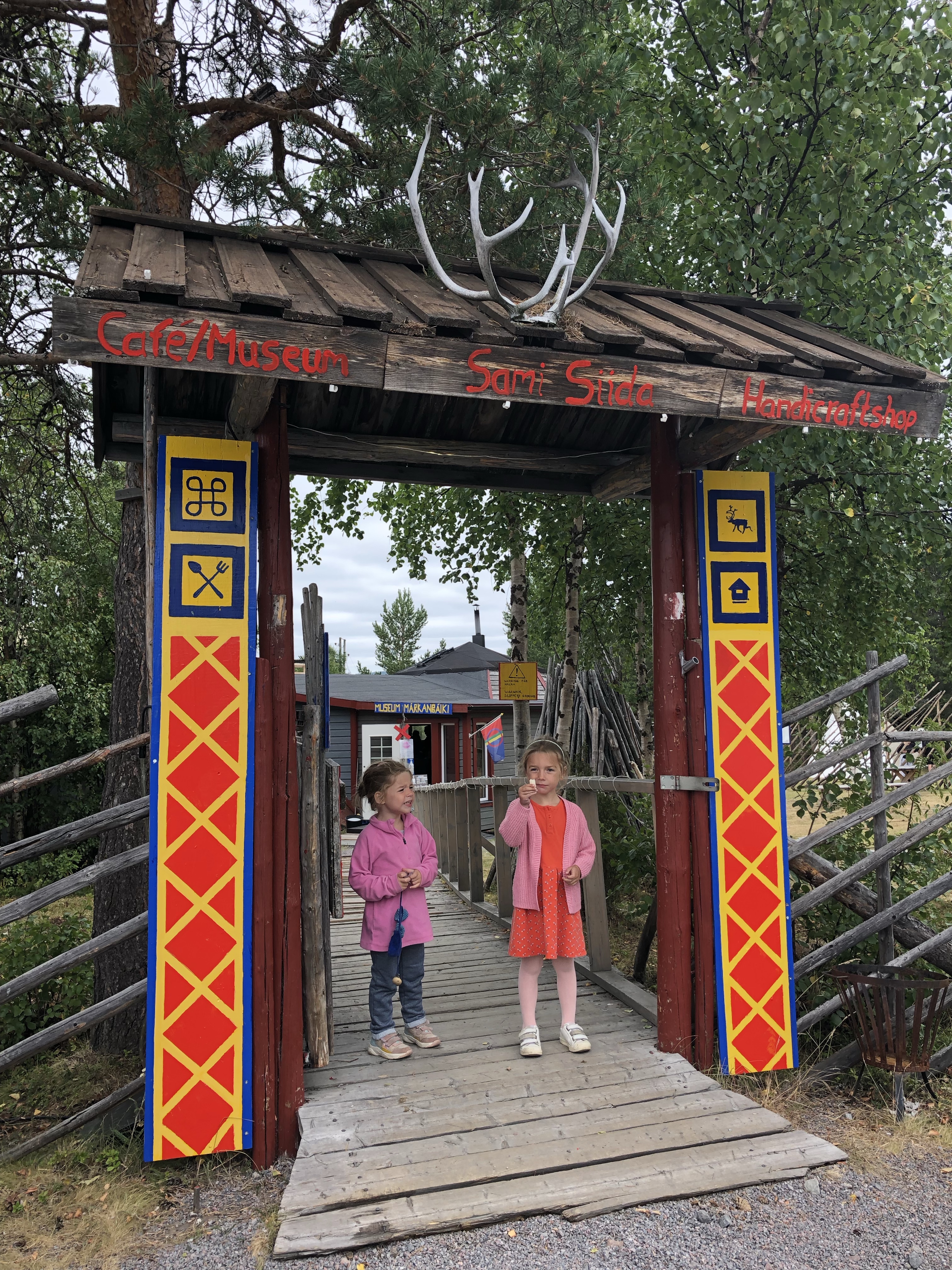 De kids lieten t niet aan hun hart komen, stapten ijverig in elke mogelijke rendiervlaai die je maar kon vinden 🙄 en bezochten mee de expo over de oude drooghutten, Sami kleding, oude tipi tenten en oefenden op lasso gooien om elanden te vangen… blijtsoep toen we ze uit de mini Sami speeltuin haalden.