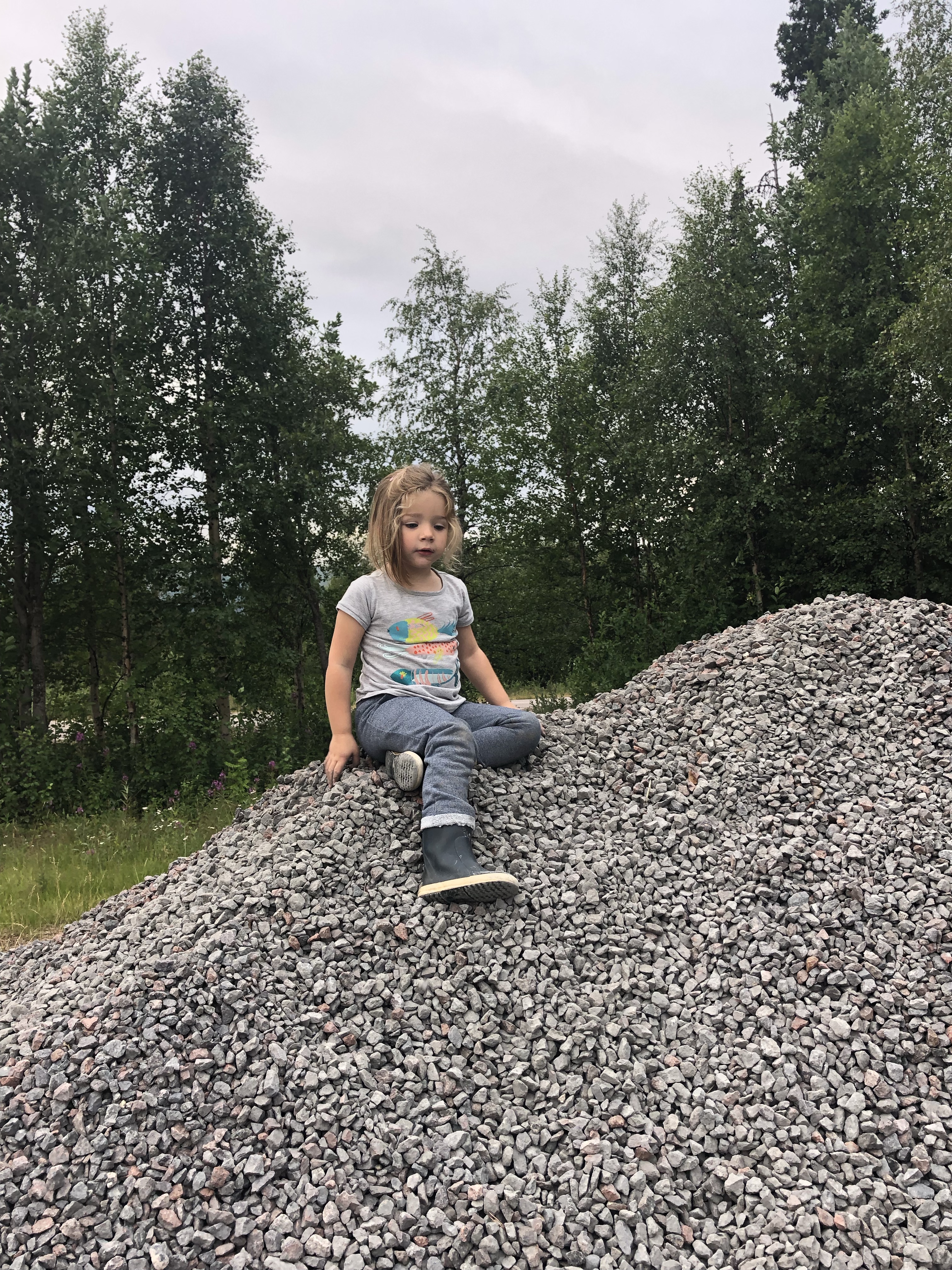 Maar door kinderogen gekeken was t er best spectaculair. Een gigantische berg kiezels (vermoedelijk om s winters boven de sneeuw te storten zodat de sneeuwketting/banden weer grip krijgen) en vooral… een stukje voor t bos met al wat nodig was voor onze avondmaaltijd.