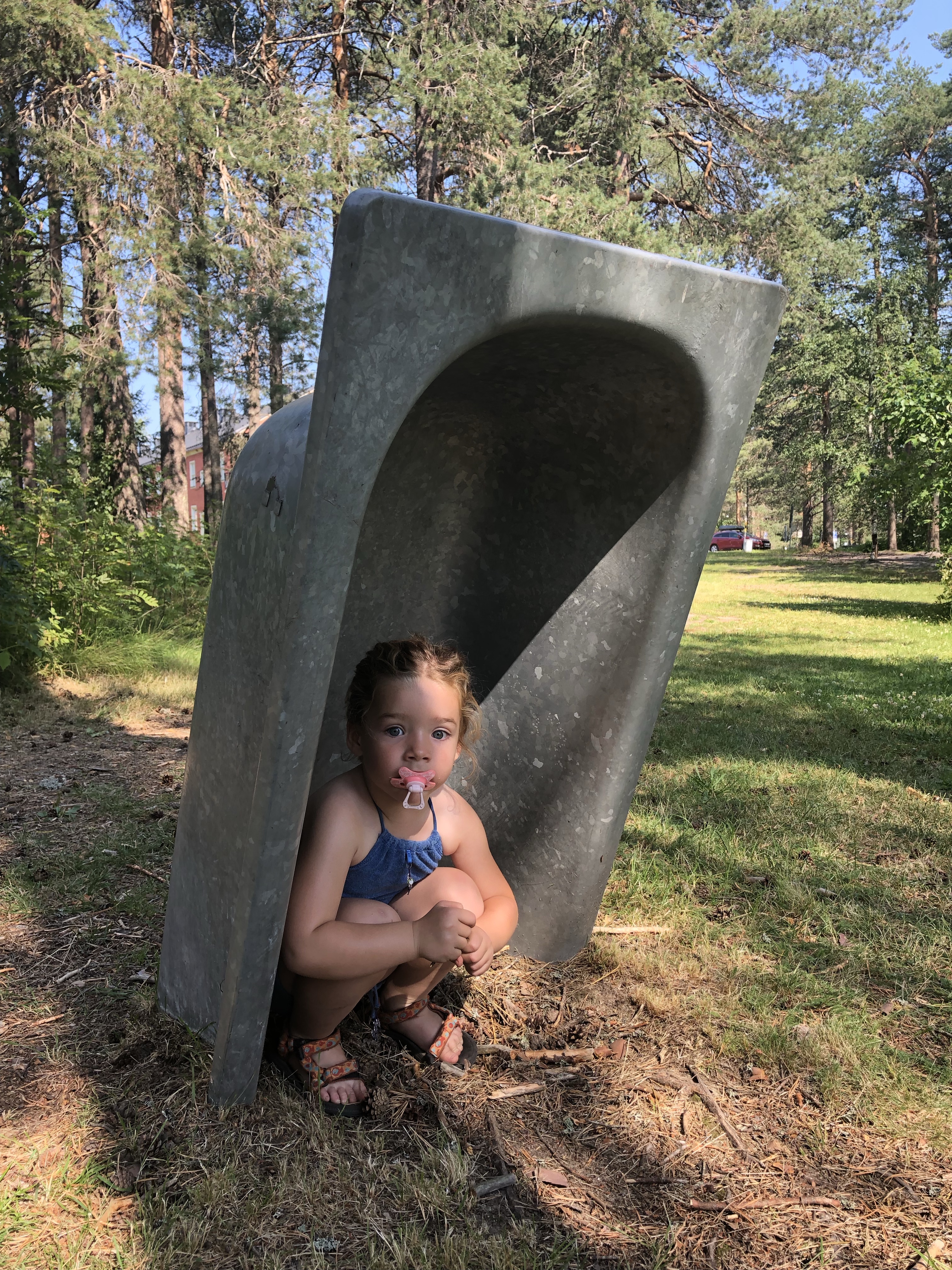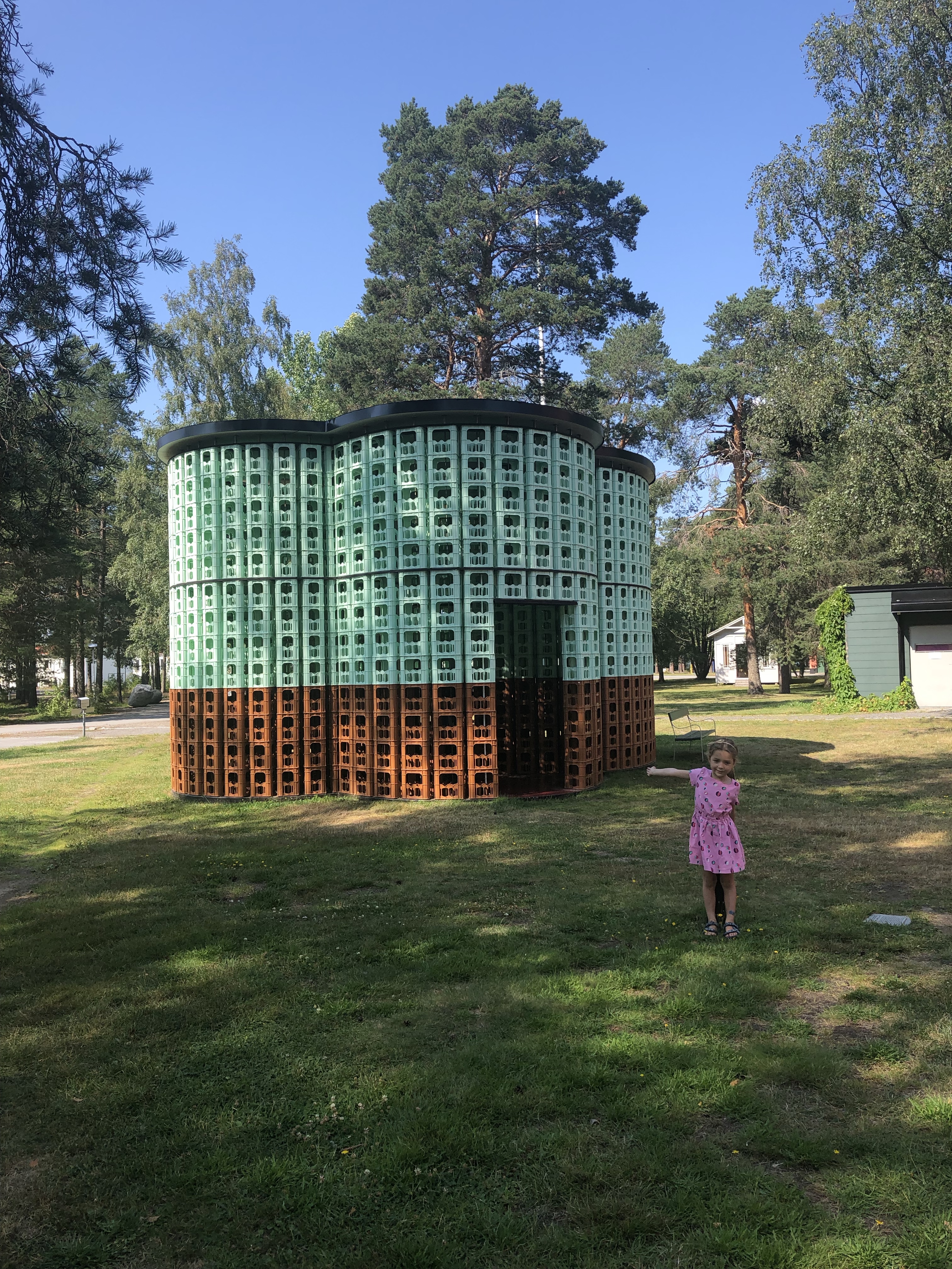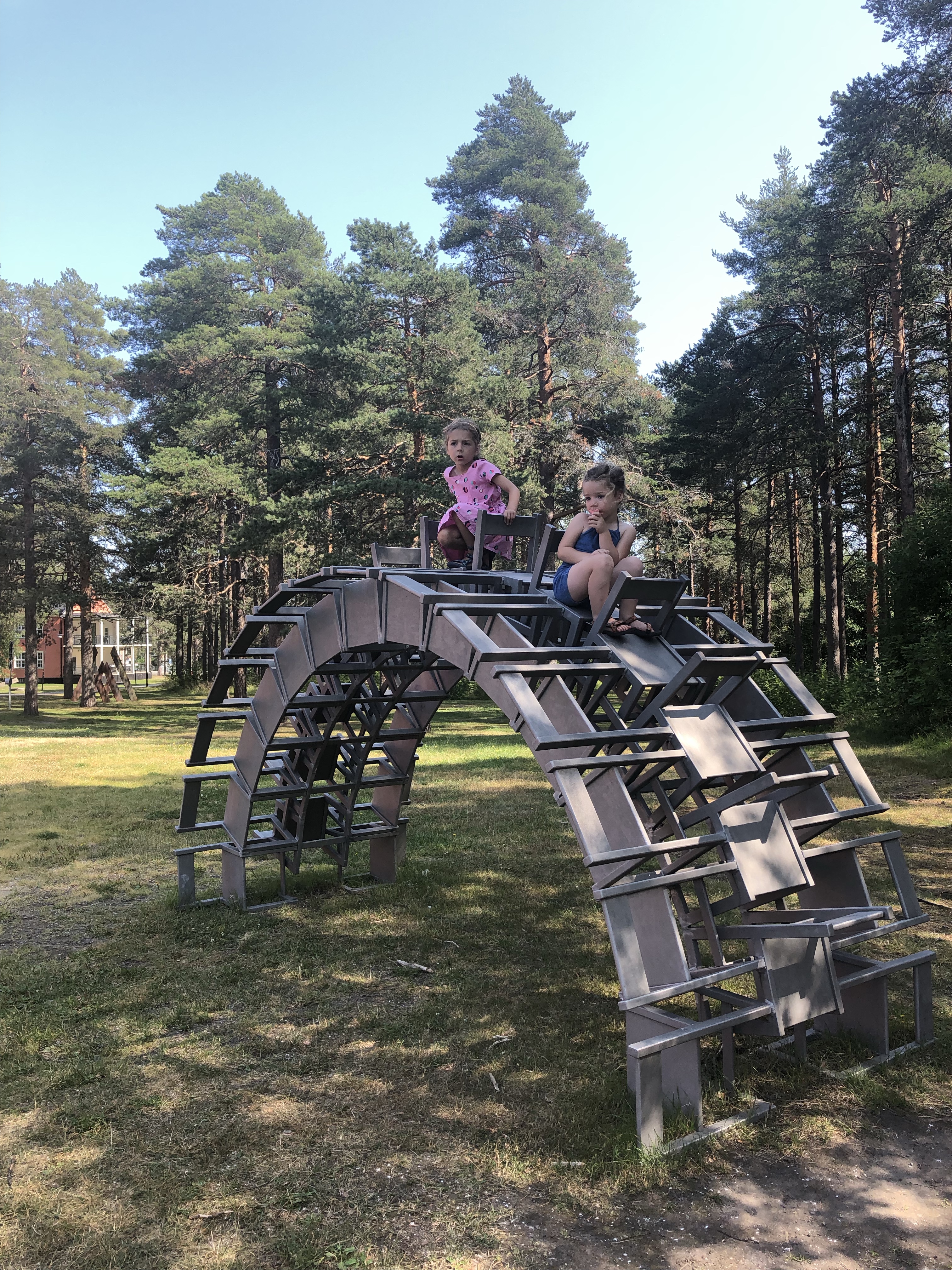 De plaats van t park was waar vroeger één van de eerste psychiatrische centra van Zweden stond. Sommige kunstenaren deden iets met die -soms bittere- geschiedenis, anderen waren gewoon creatief met alledaagse materialen zoals de giga waslijn van oude kleren, de boog van “stalen stoeltjes” of t oranje/groene huisje van “Duitse water-bakken” 🤭