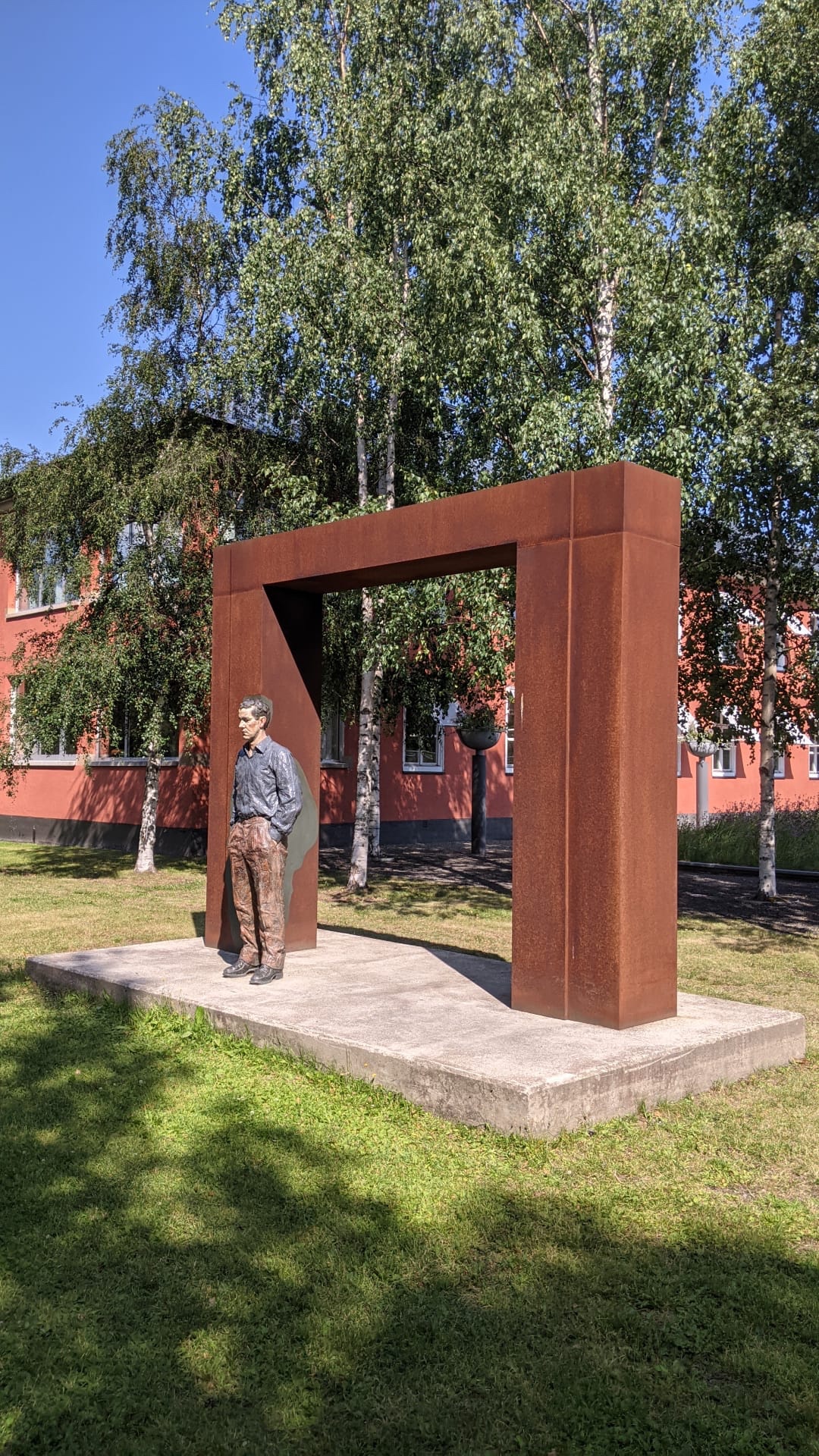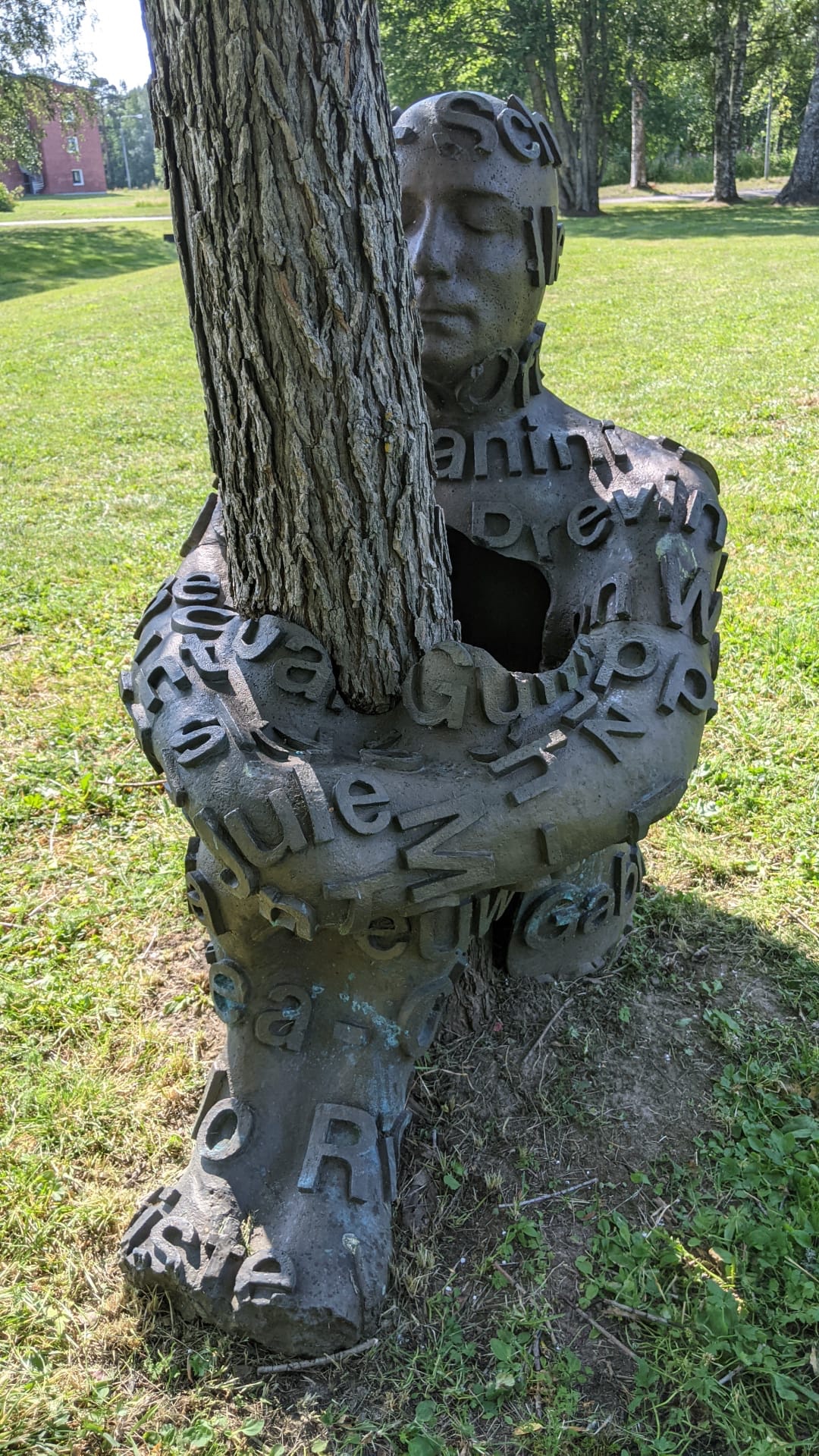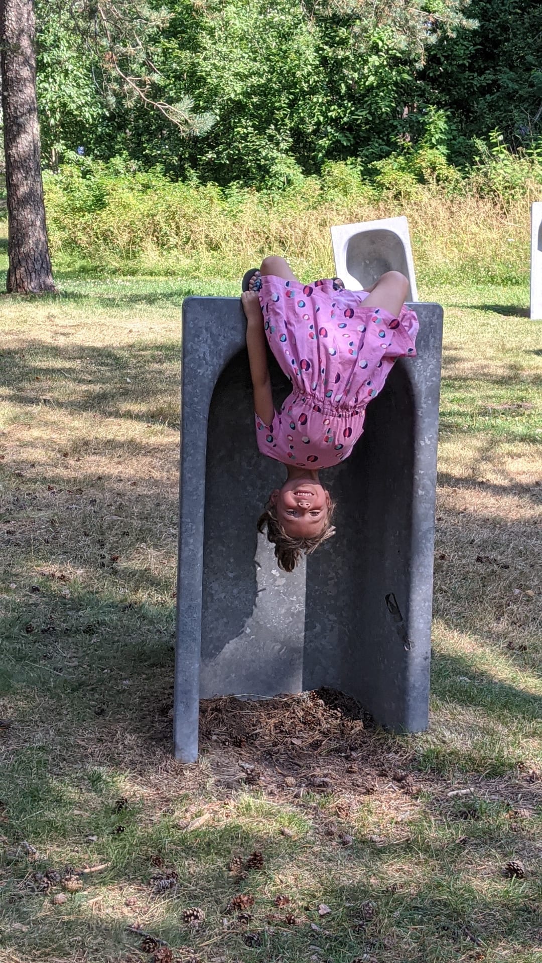 De plaats van t park was waar vroeger één van de eerste psychiatrische centra van Zweden stond. Sommige kunstenaren deden iets met die -soms bittere- geschiedenis, anderen waren gewoon creatief met alledaagse materialen zoals de giga waslijn van oude kleren, de boog van “stalen stoeltjes” of t oranje/groene huisje van “Duitse water-bakken” 🤭