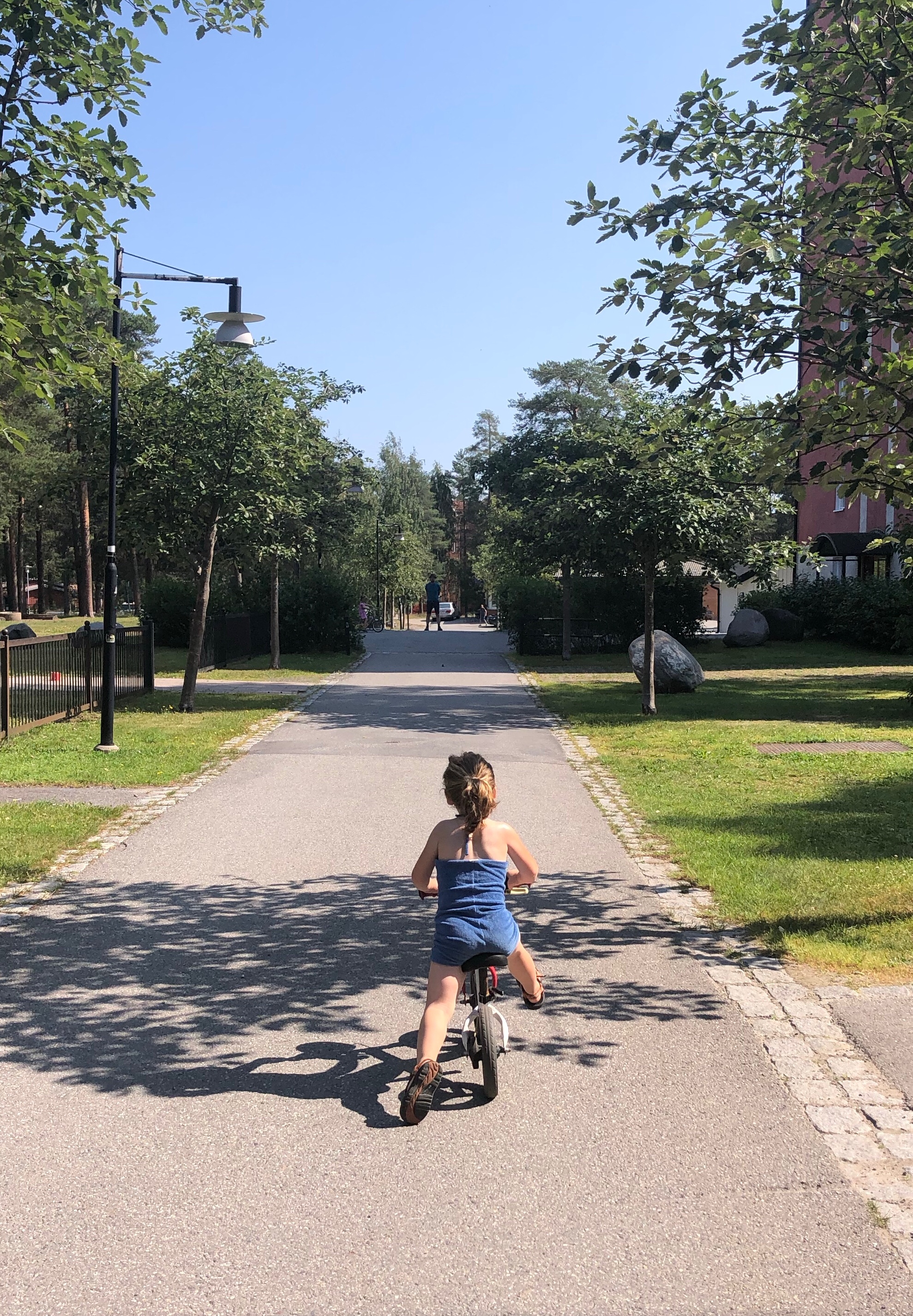 We parkeerden aan een steigertje maar werden al meteen weggejaagd omdat t privegrond was. Daarna richting de camping van Vällen maar die was opnieuw enkel te boeken met Swish OF als ze open was van 11-16u (zeer toeristenvriendelijk uur 🤭). Dus wij 2 wielrenners aangesproken en de vrouw verwees ons naar een havenplaatsje in Alhalm. We reden een soort van Centerparcs achtig domein door en parkeerden ons uiteindelijk aan een geultje met prachtig zicht… Alleen, ik kon me niet ontdoen van t idee dat we bekeken werden…